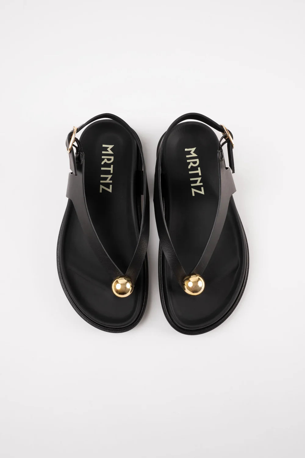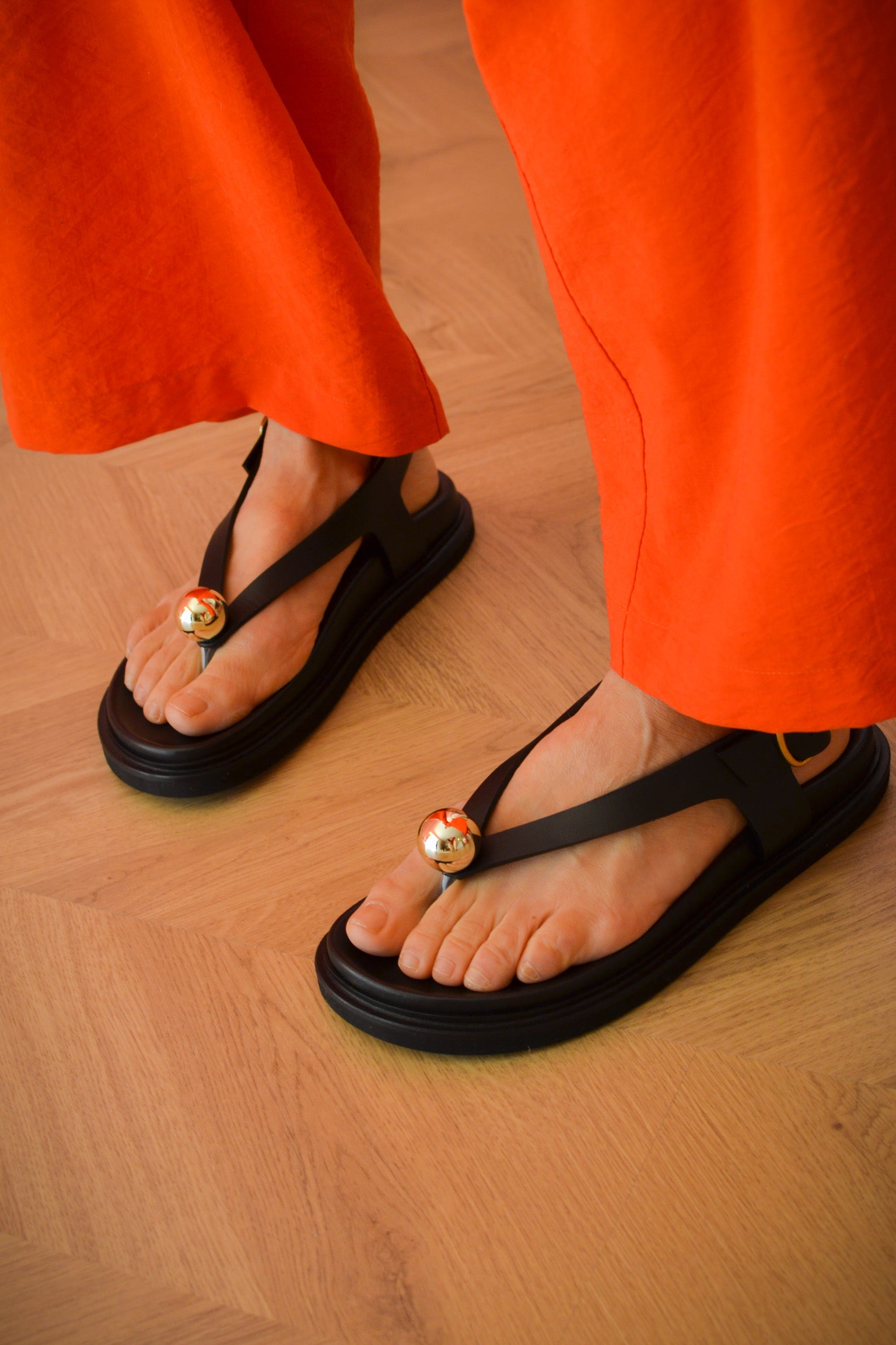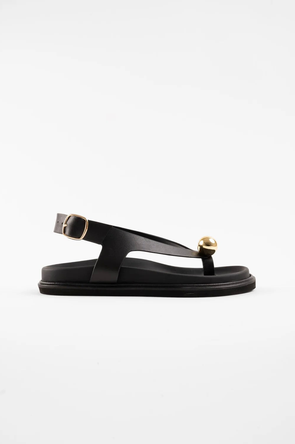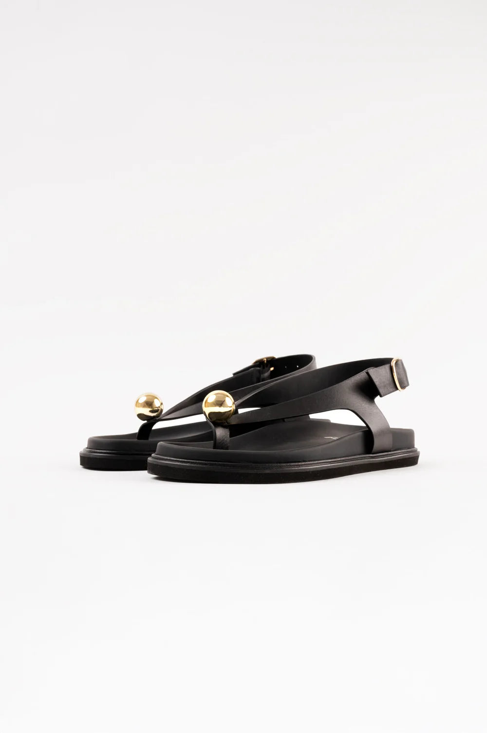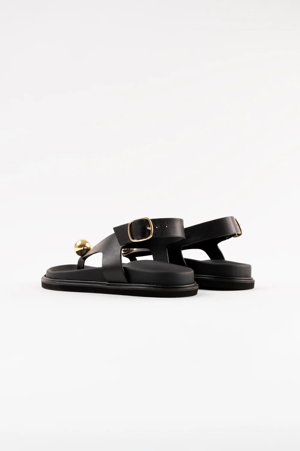 Refined and minimalist, these sandals perfectly balance timeless elegance and modern design. Their clean, asymmetric lines are elevated by a striking gold sphere detail, adding a touch of bold sophistication.