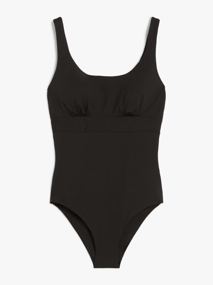 Active-style swimsuit in pilling-resistant and breathable double-faced jersey fabric. The moisture-wicking quick-dry stretch fabric with a UPF 50+ protection factor makes the wearer feel comfortable all over. The model boasts a buckle close back neckline and a gold-coloured branded tag, crafted from a special chlorine, salt and sun cream-resistant alloy. Embellished with visible under-bust darts for a better fit.