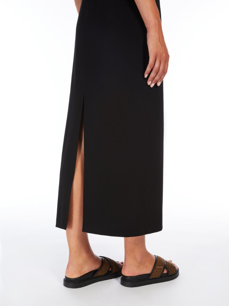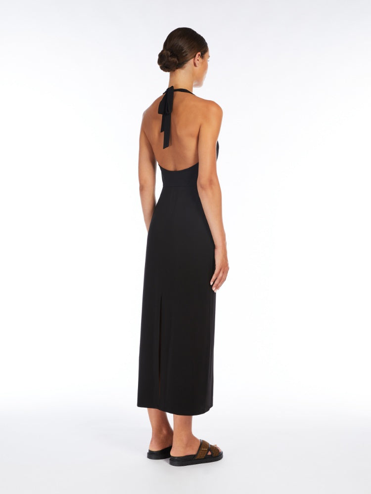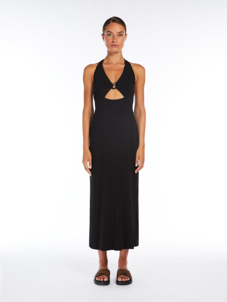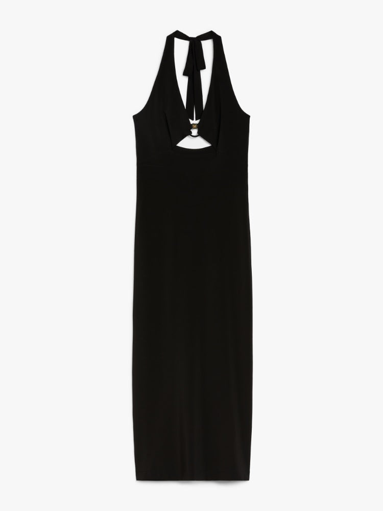 Long sleeveless dress in viscose crepe jersey fabric. The feminine, fluid-fit model boasts a plunging V-neckline with central hoop detail, in addition to cut-out detail below the bust. Embellished with a wide round back neckline, central rear hem slit and tone-on-tone topstitching. Ties that fasten at the back of the neck.