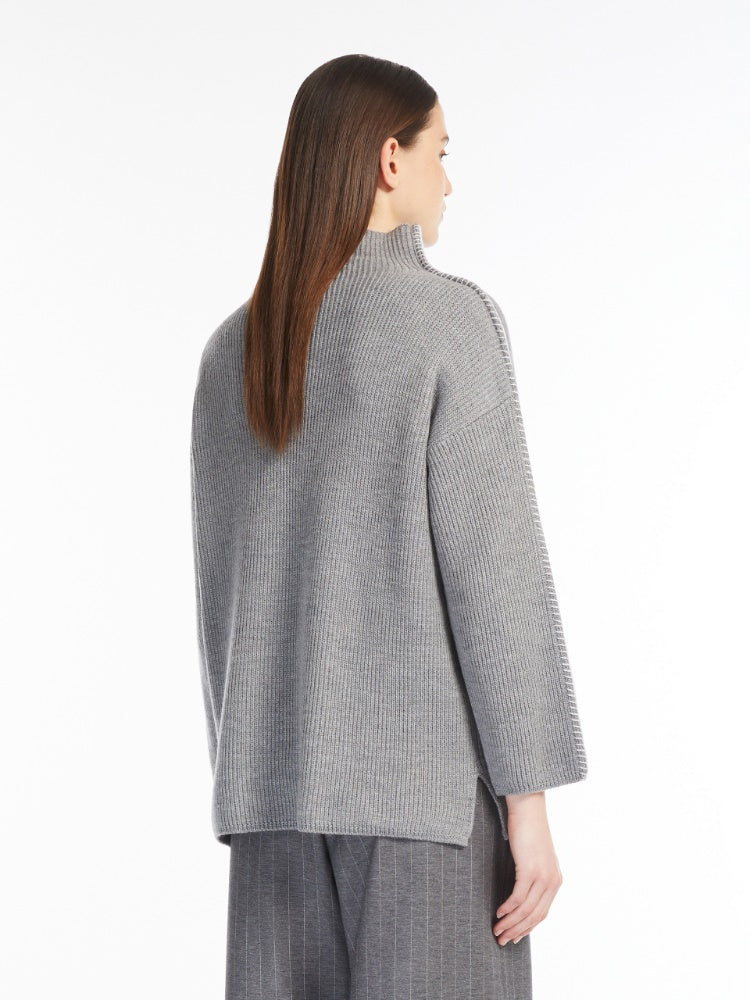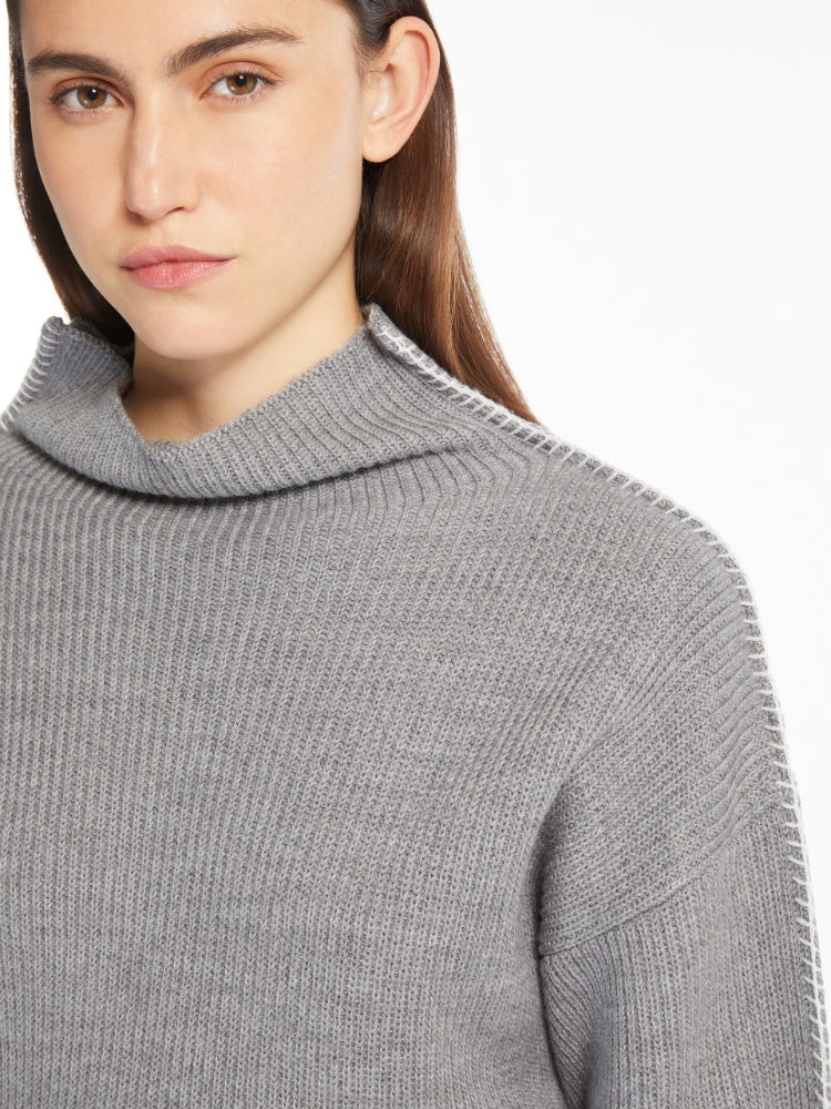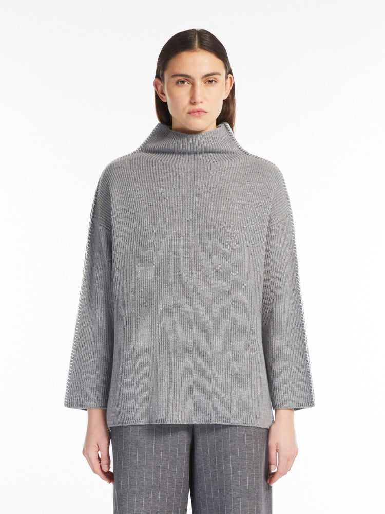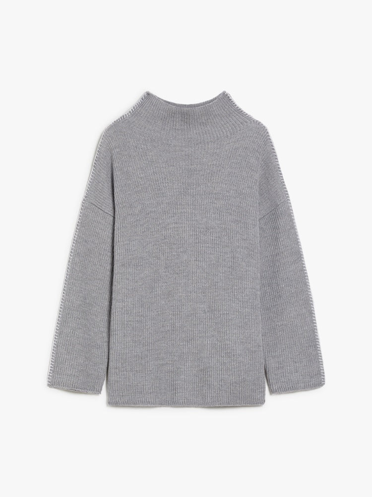 This jumper in luxurious wool yarn stands out thanks to its boxy silhouette, crater neck, long low-set sleeves and small side slits at the hem. The English ribbed knit is finished with contrasting embroidery details that embellish the garment.