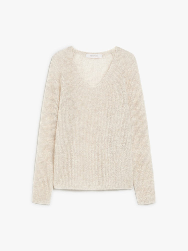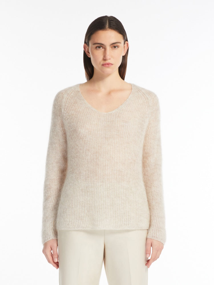 Jumper in a soft mohair blend yarn, with V-neck and long raglan sleeves. The English ribbed knit gives the garment a distinctive texture.