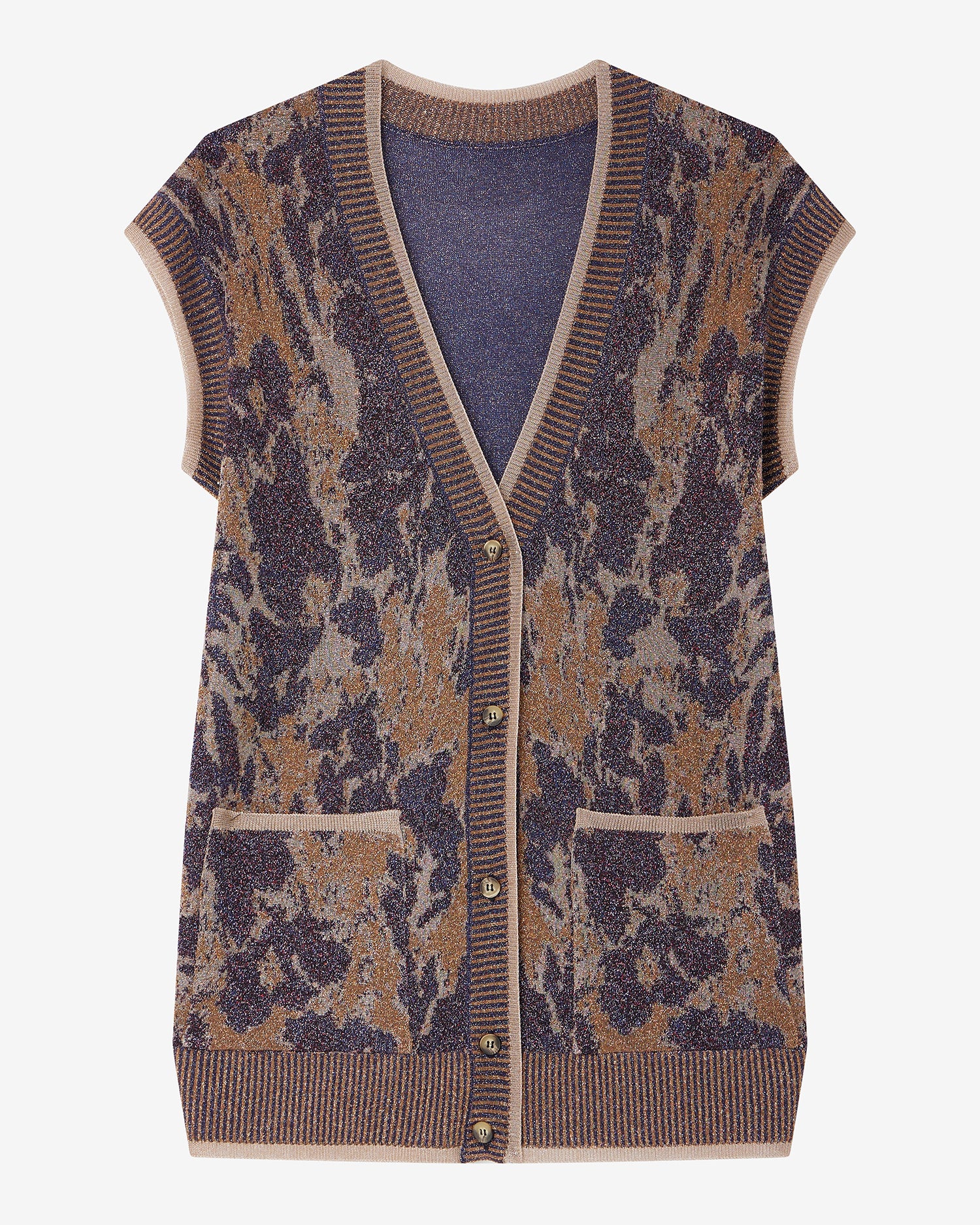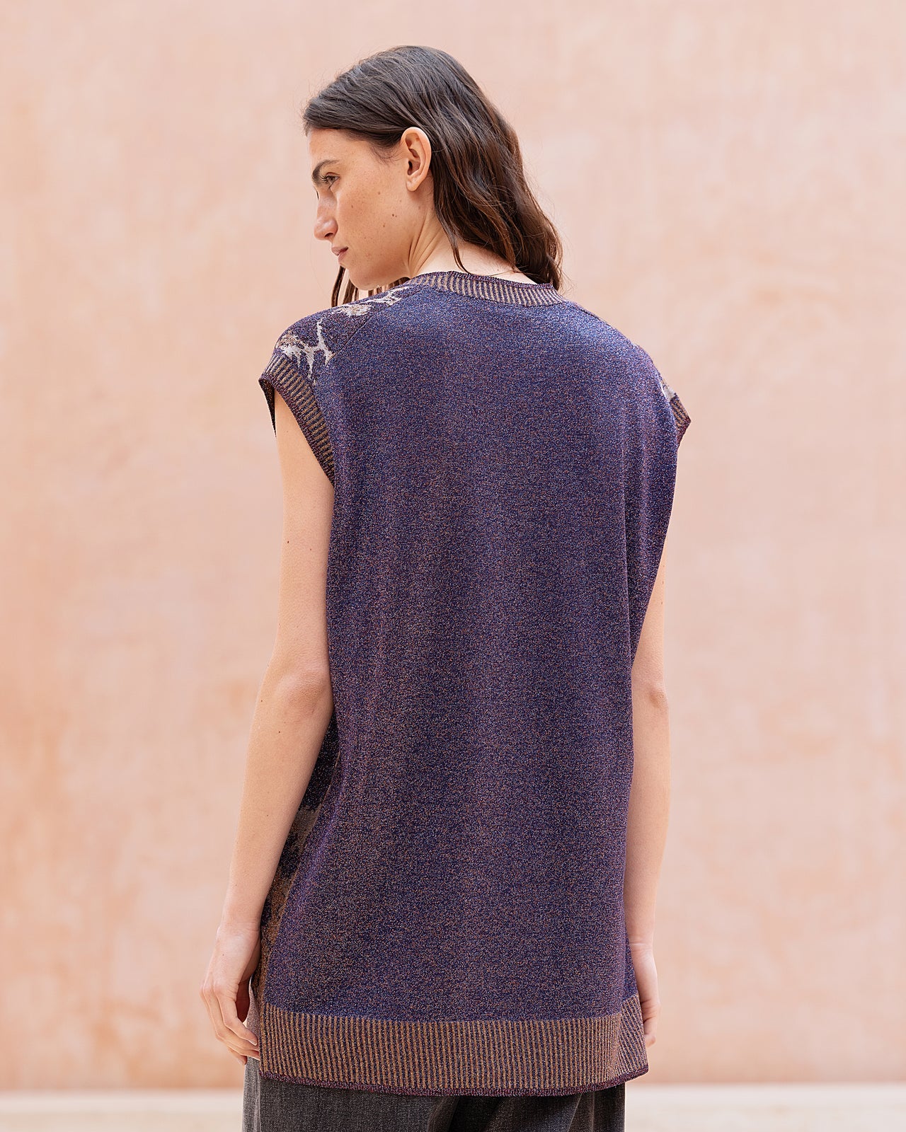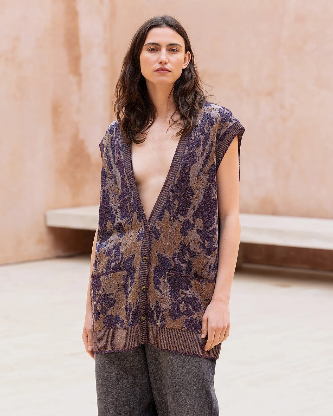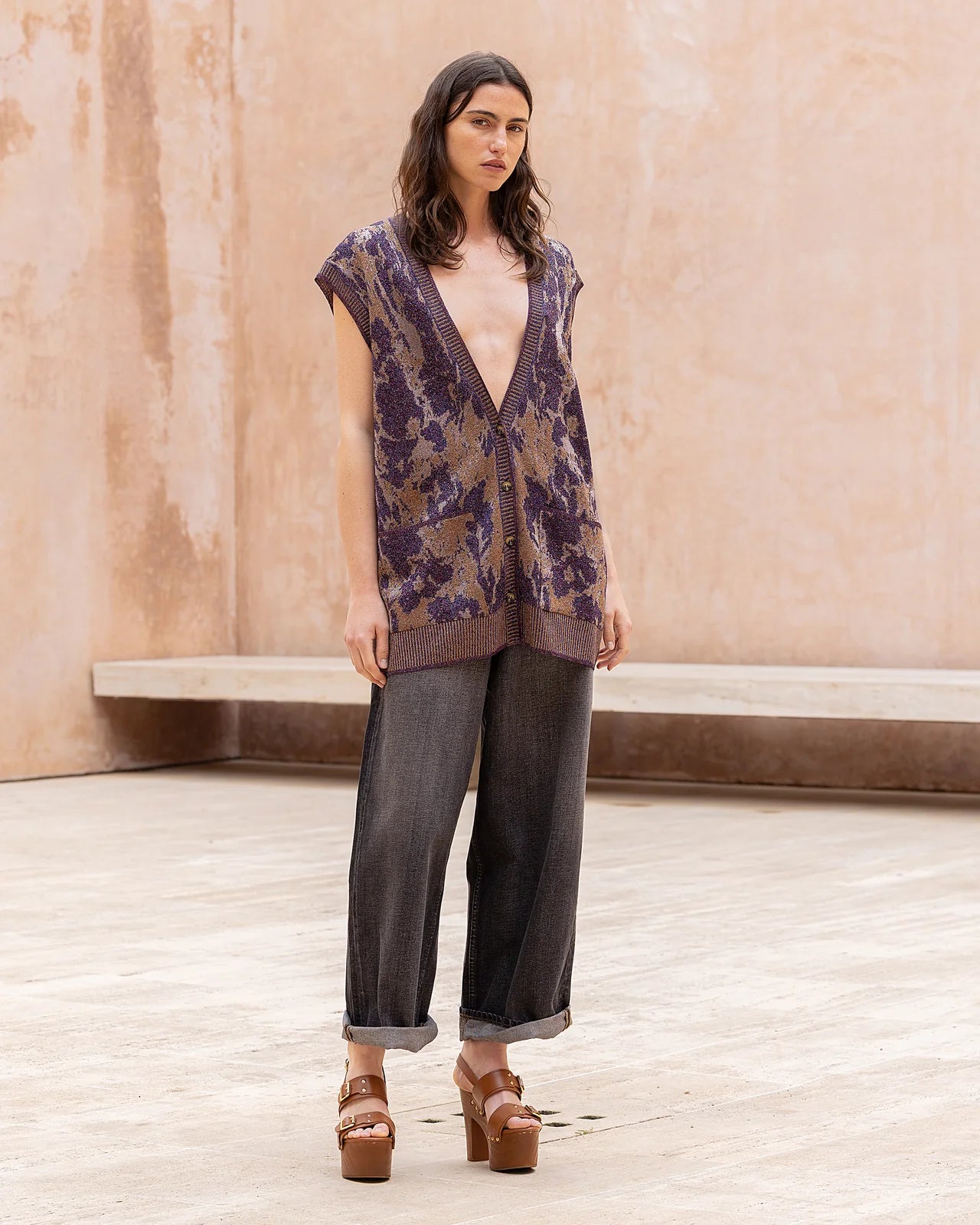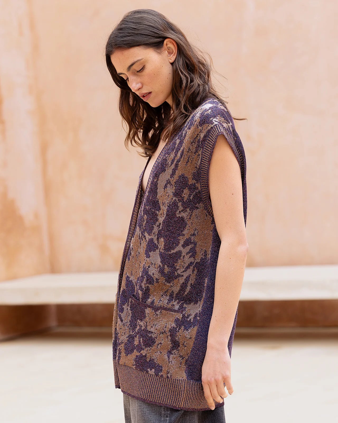 This long maxi cardigan in shades of violet and natural tones draws inspiration from timeless retro styles, reimagined in a contemporary and luxurious way. Crafted from a soft Italian yarn, it is enhanced with a subtle lurex thread that adds a delicate shimmer. The ultra-fine jacquard patterns that run throughout the piece create a refined play of texture and depth, making this model both comfortable and elegant. A sophisticated addition to any wardrobe, blending classic charm with modern luxury.