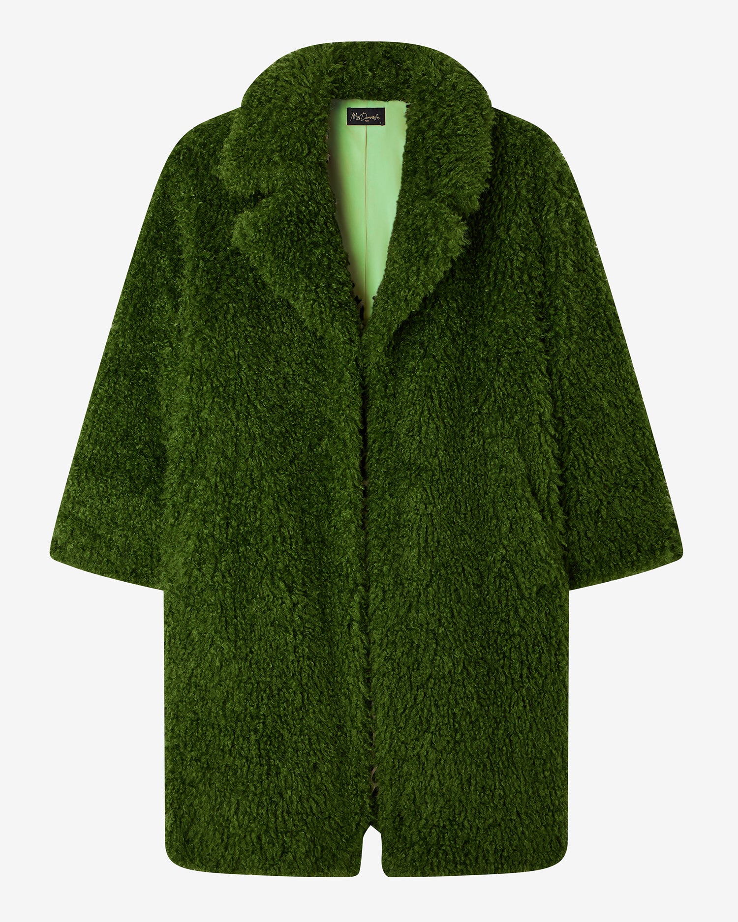 This coat wraps the silhouette in a generous, plush volume, thanks to its soft boucle-effect texture.