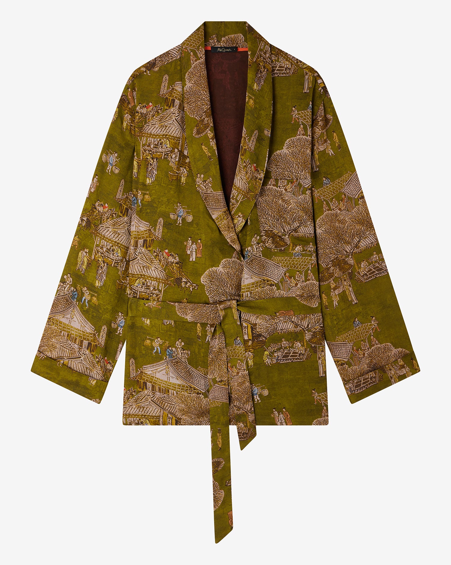 This viscose jacquard kimono is presented on a deep green background, elevated by a refined print playing with contrasts.