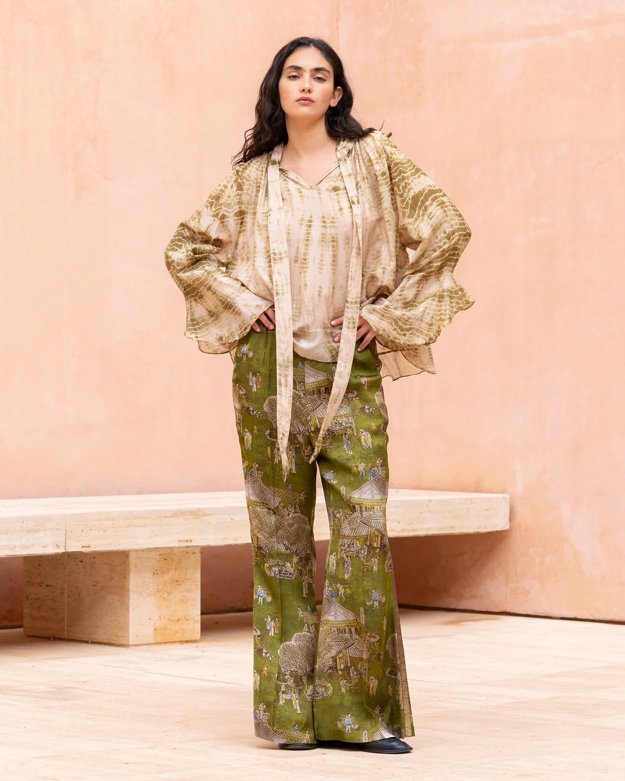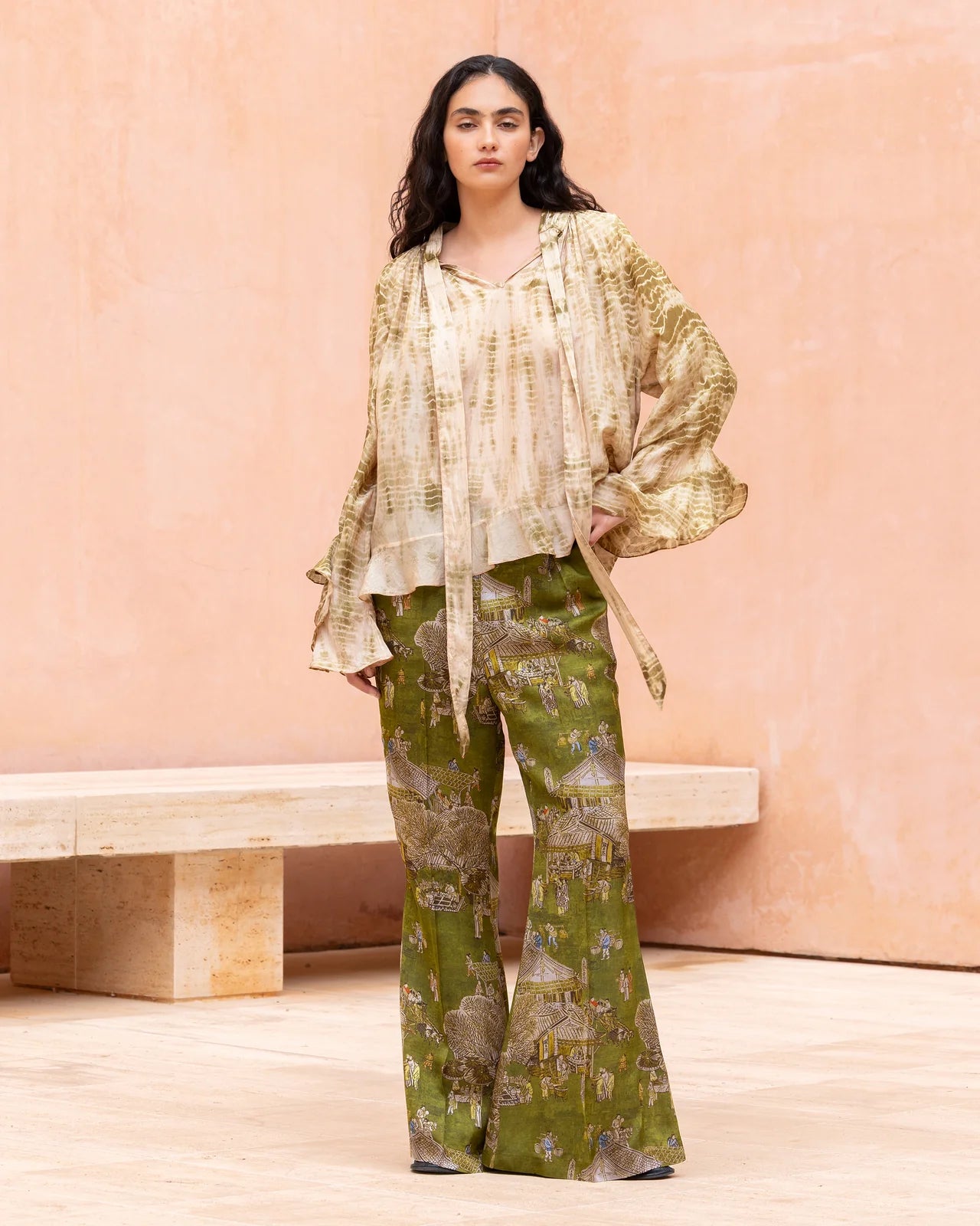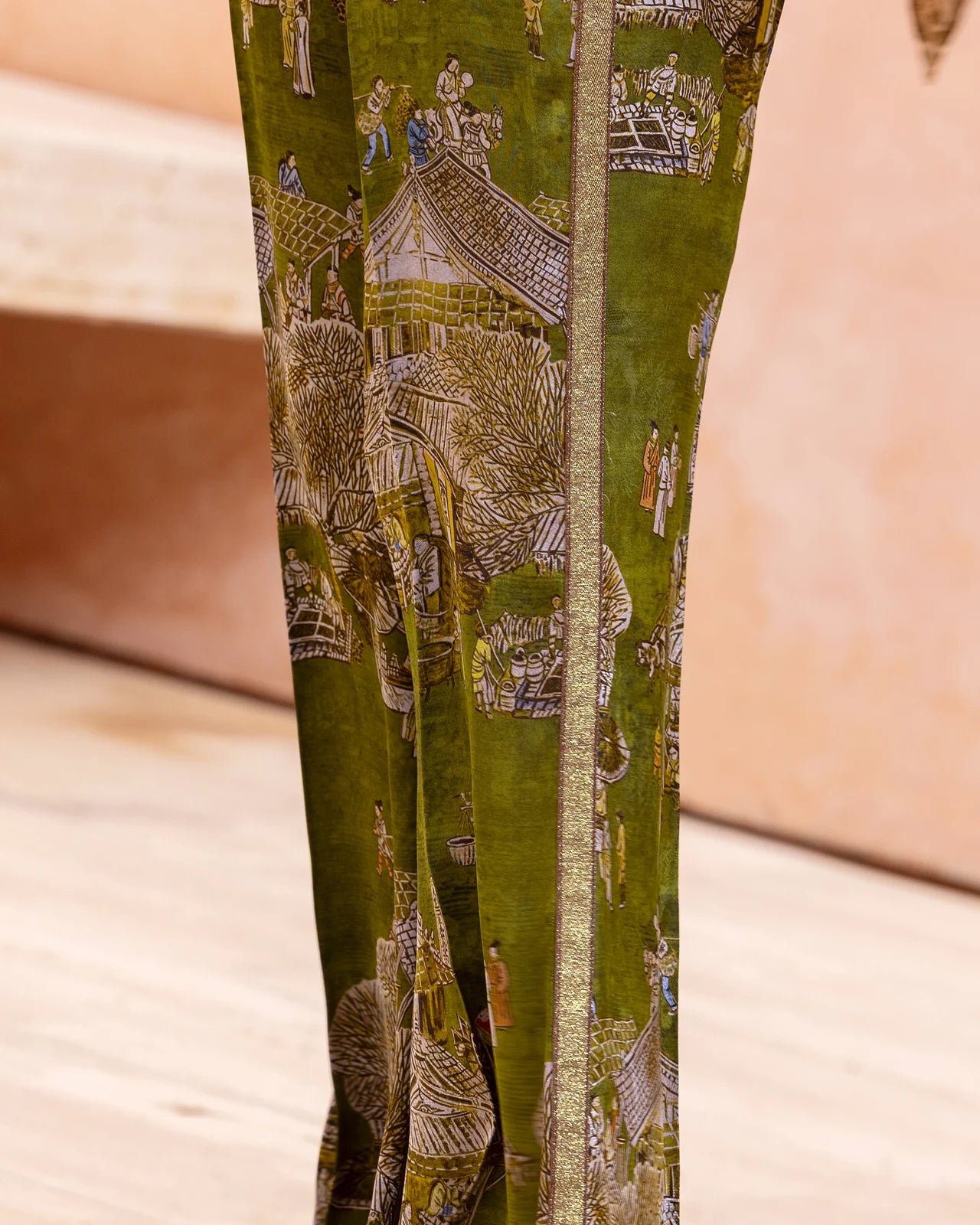 Our flared pants in printed viscose jacquard on a deep green background blend comfort and seventies flair.