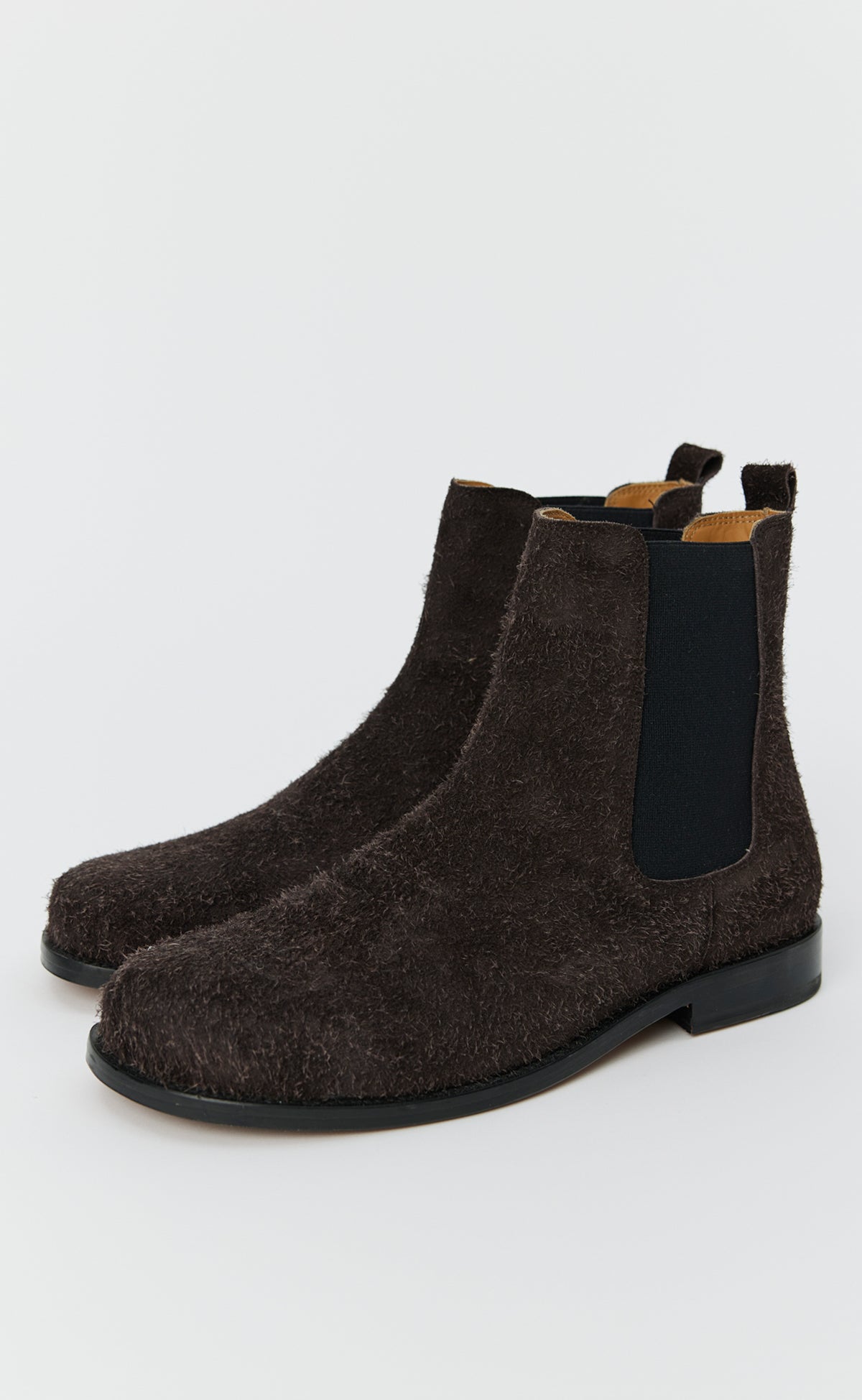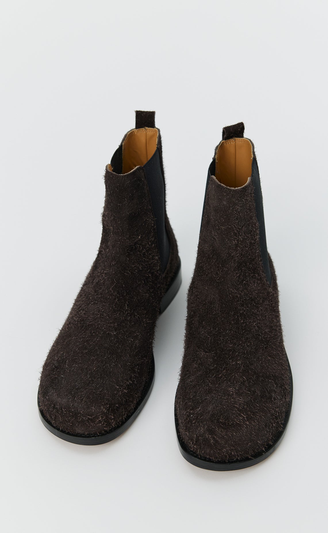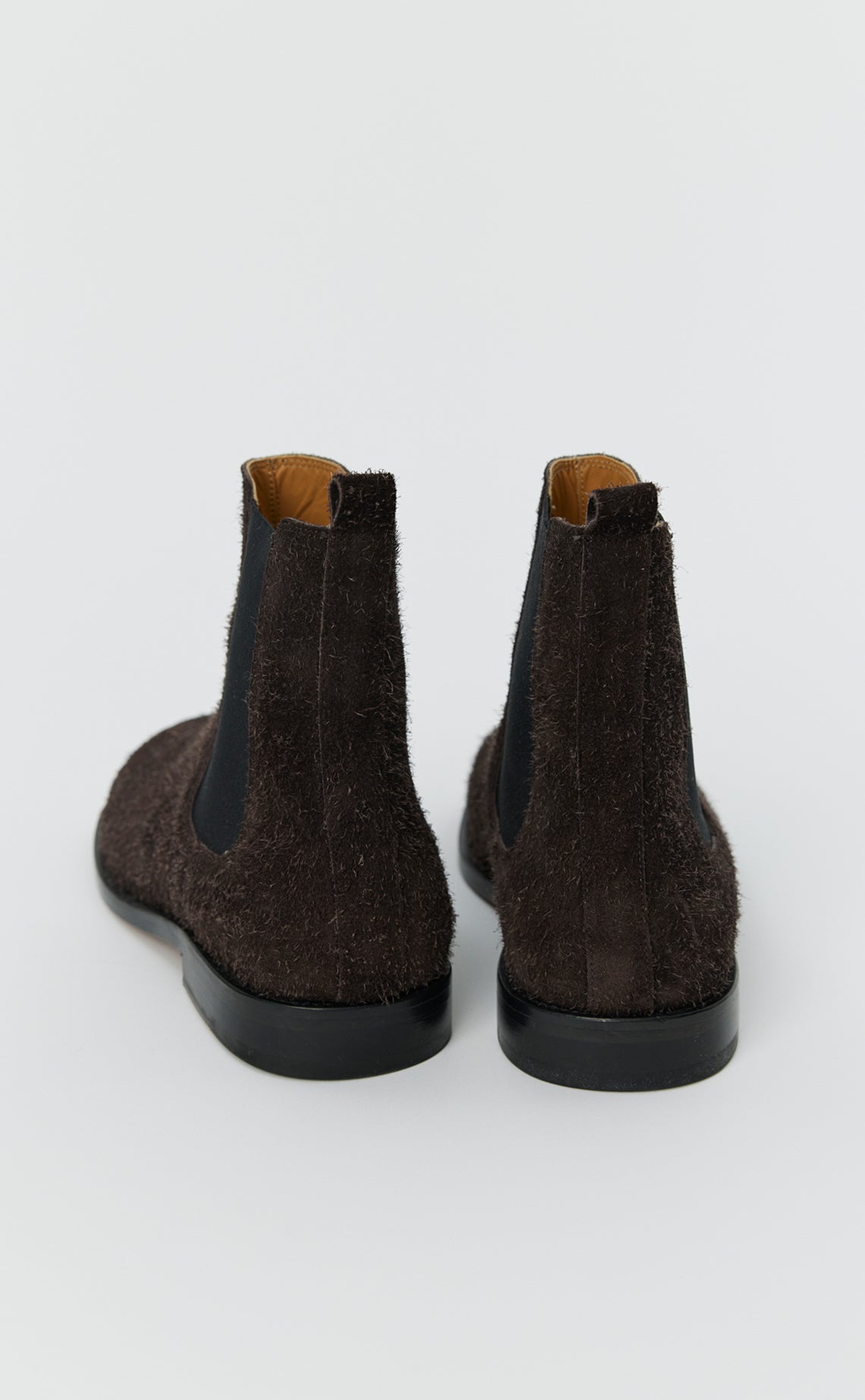 The Core Boot is crafted from dark brown suede cow leather with a hairy finish. Featuring a storm welt leather sole with low stacked heel and an aniline leather lining for breathability and comfort.
