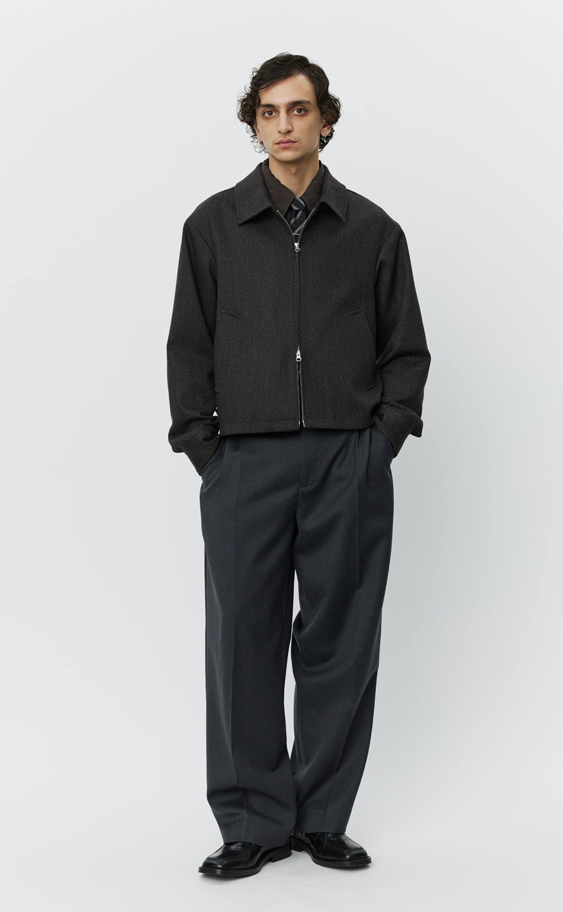 The Mail Jacket has a boxy fit with drop shoulders. Made with two-way zip, side pockets, sleeve and front body lining and adjustable tabs at the waist. Cut from an Italian virgin wool blend with a brown multi stripe on a black ground.
