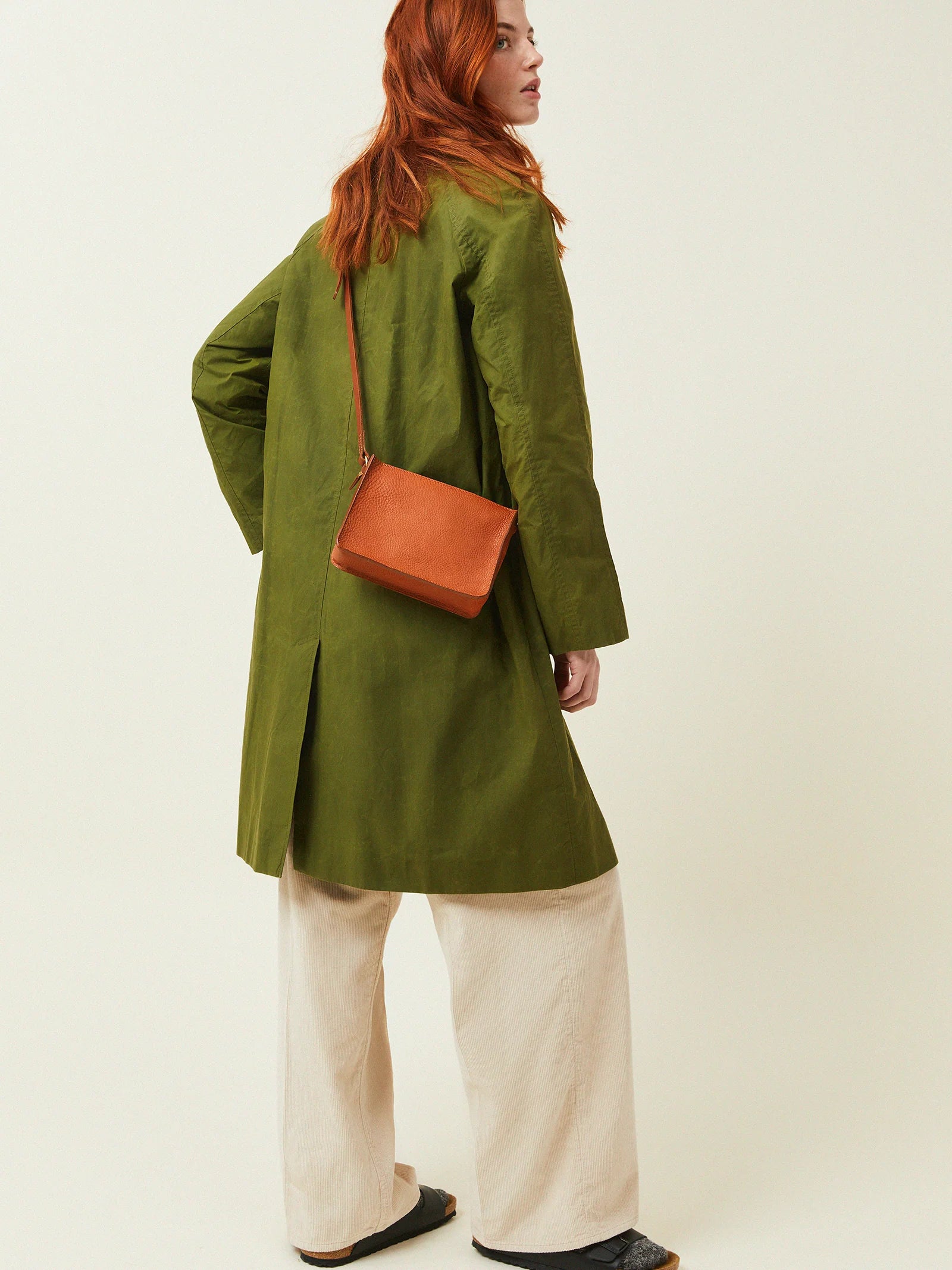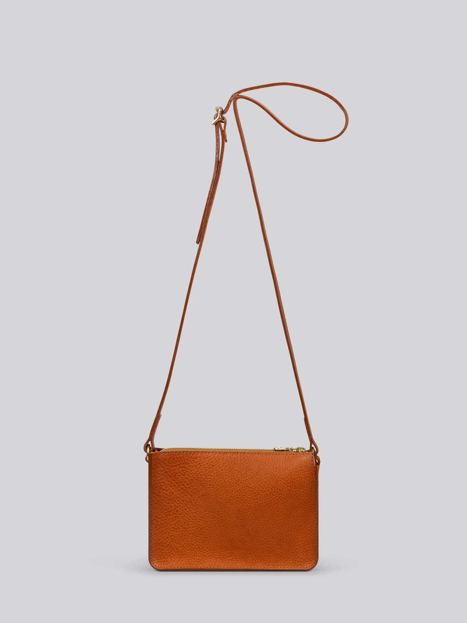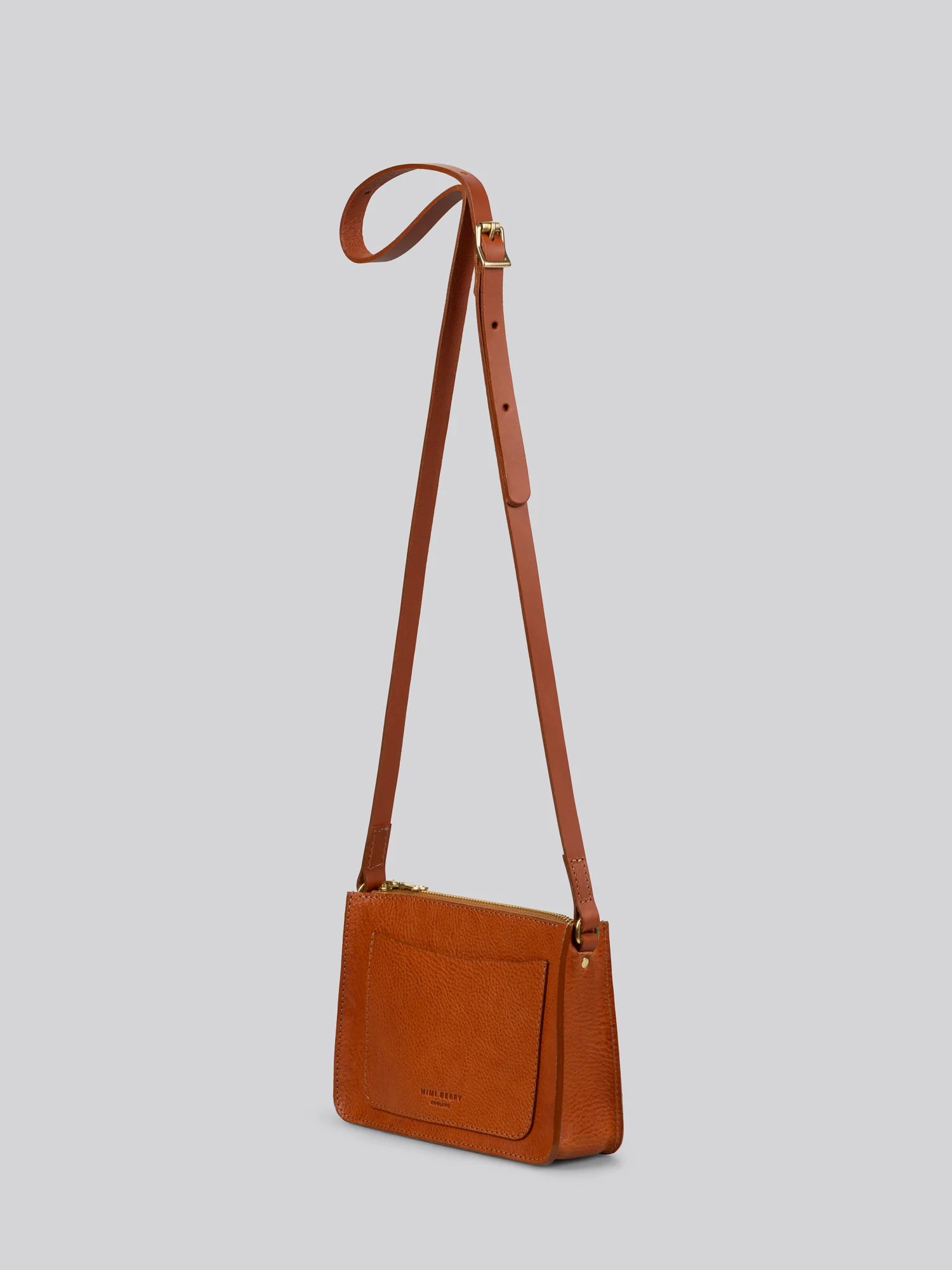 Made from Italian, grainy, veg tanned leather. Long, buckled, bridle strap. One back pocket. Brass fittings. Unlined.