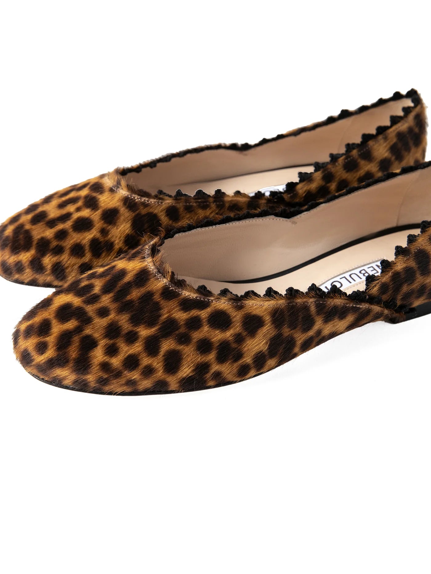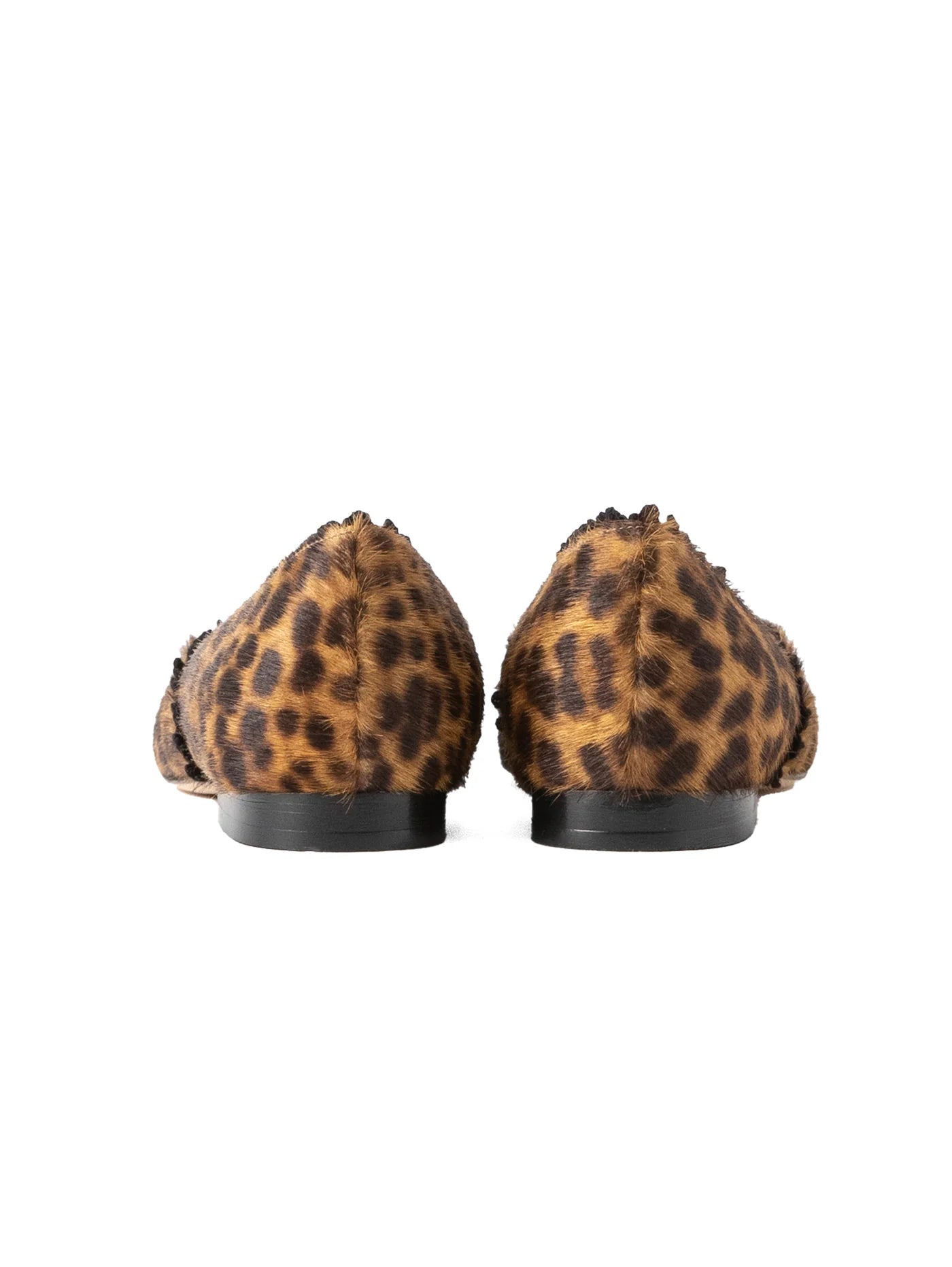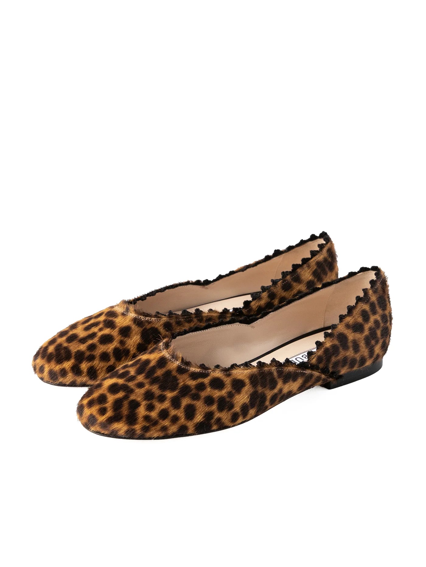 A sophisticated reinterpretation of a timeless classic. These flats are crafted in genuine haircalf leather, finished with delicate lace trimming that lends subtle definition to the silhouette. The leopard motif is artfully balanced—bold enough to make a statement, yet understated enough to blend seamlessly into a refined wardrobe. Elegant side cut-outs elongate the line of the foot, creating a look that is both graceful and modern.