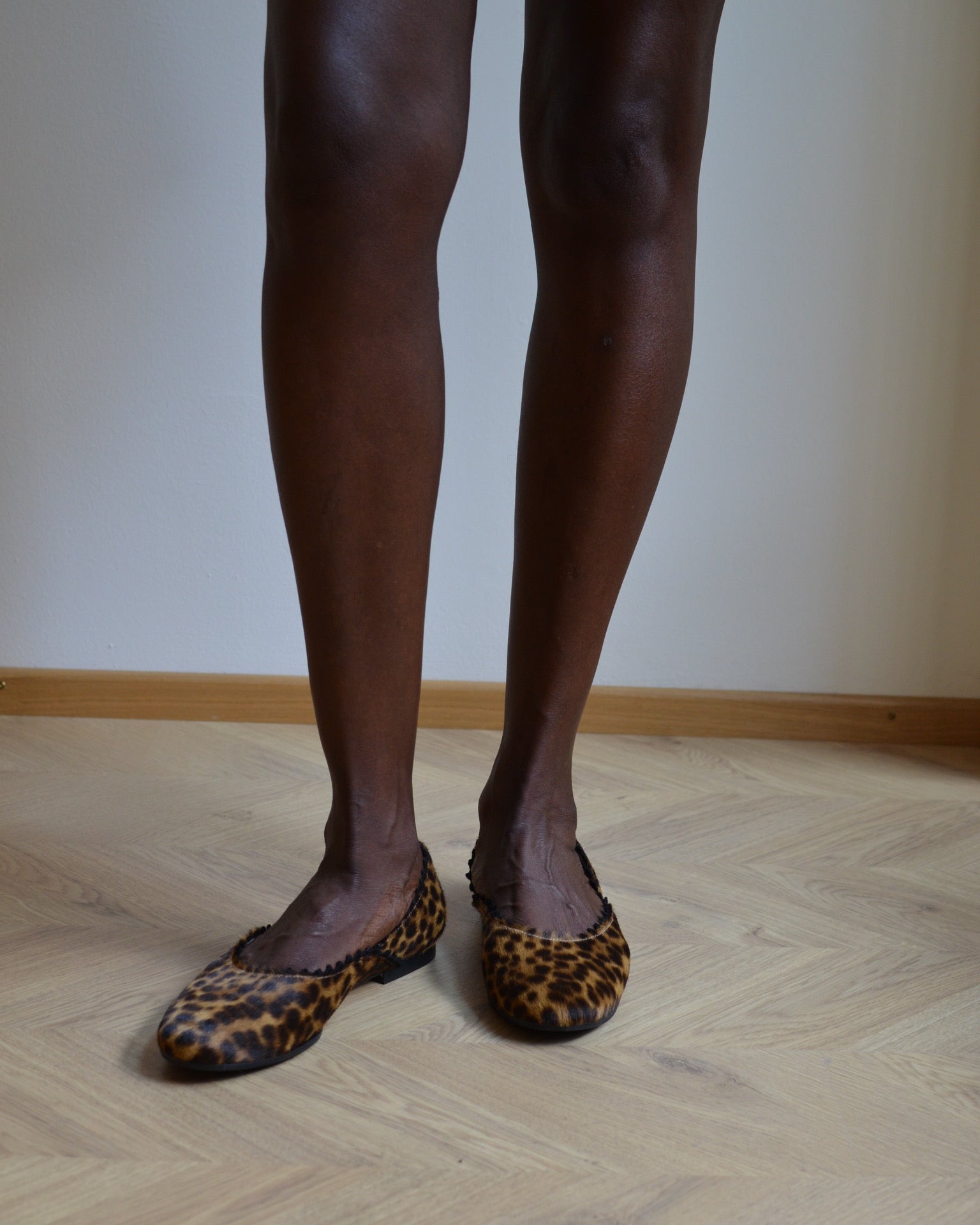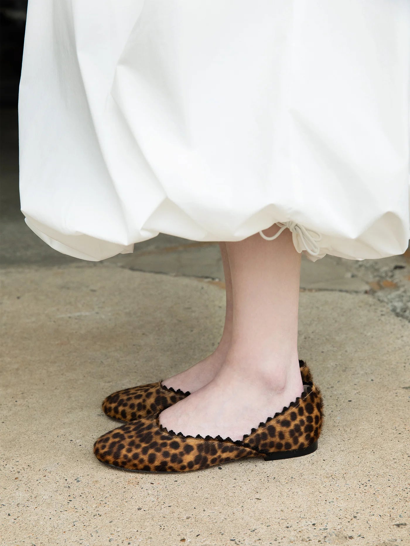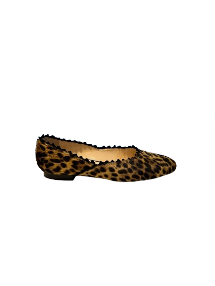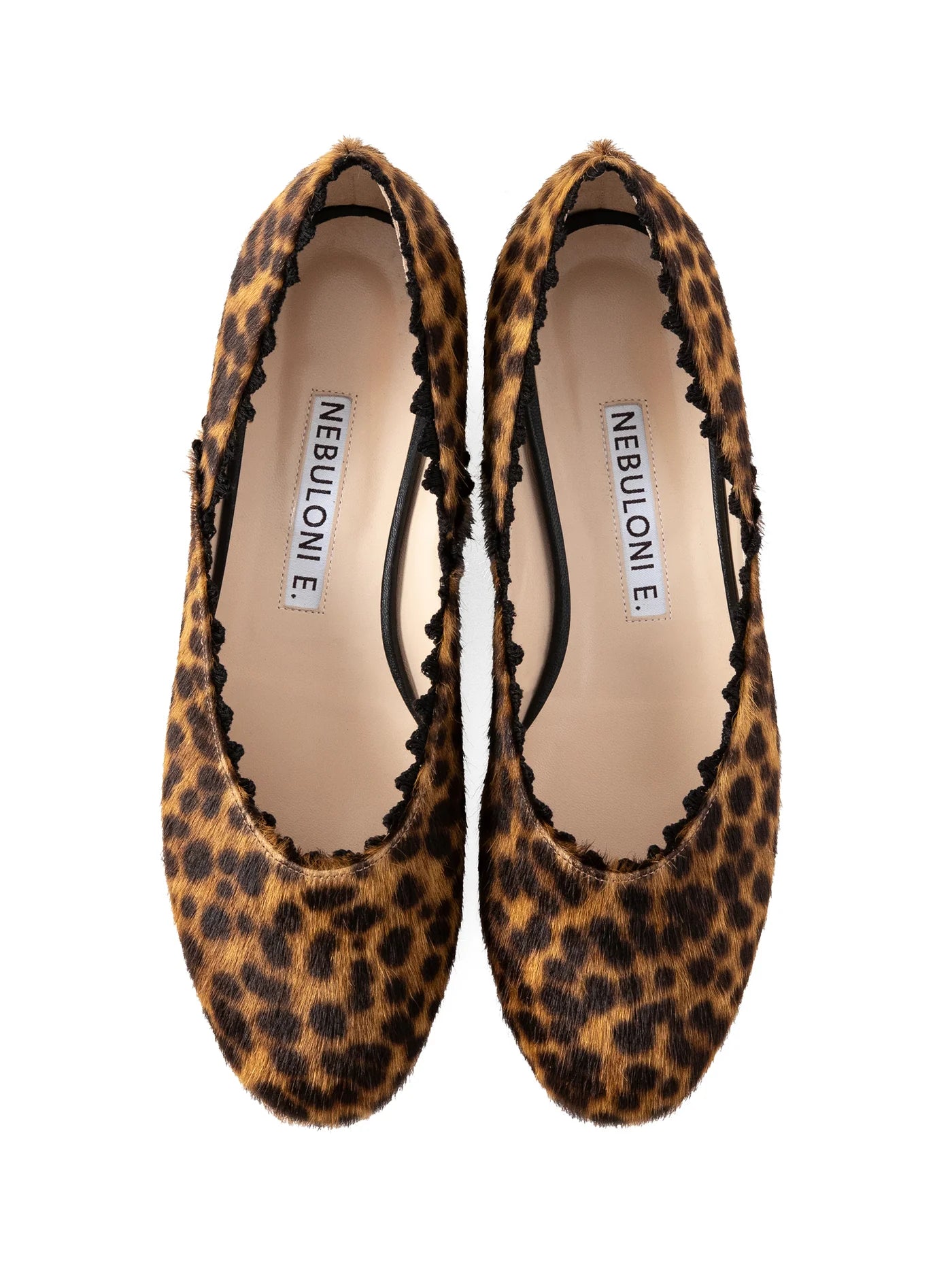 A sophisticated reinterpretation of a timeless classic. These flats are crafted in genuine haircalf leather, finished with delicate lace trimming that lends subtle definition to the silhouette. The leopard motif is artfully balanced—bold enough to make a statement, yet understated enough to blend seamlessly into a refined wardrobe. Elegant side cut-outs elongate the line of the foot, creating a look that is both graceful and modern.
