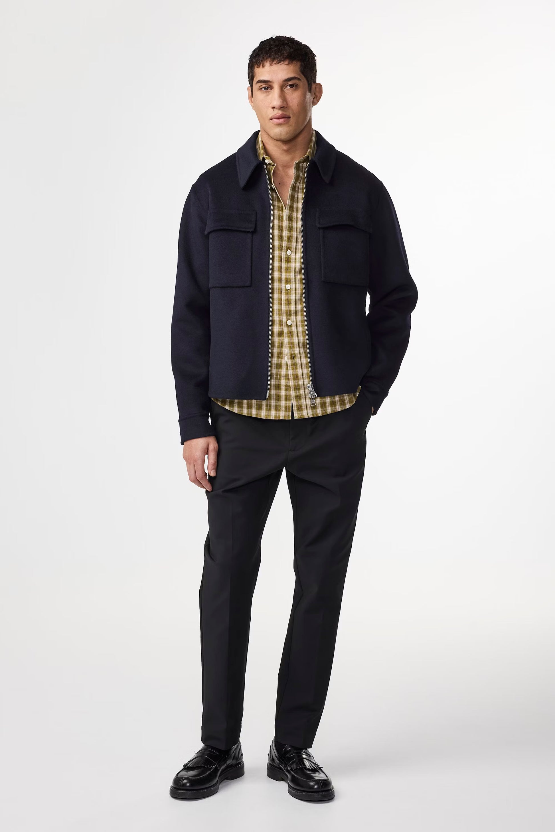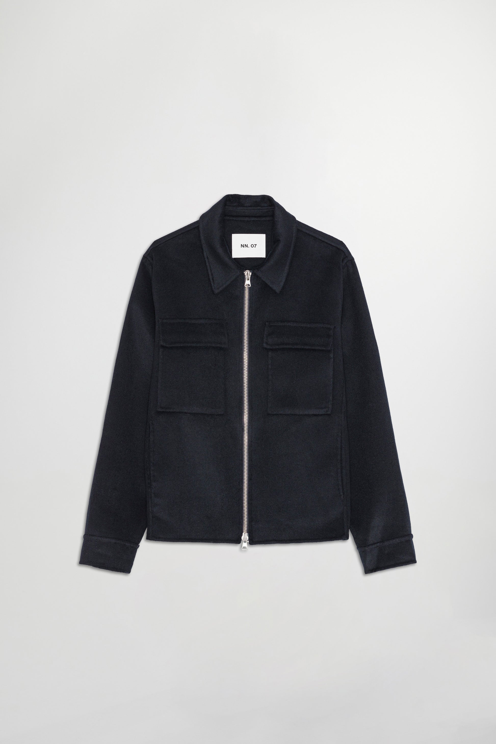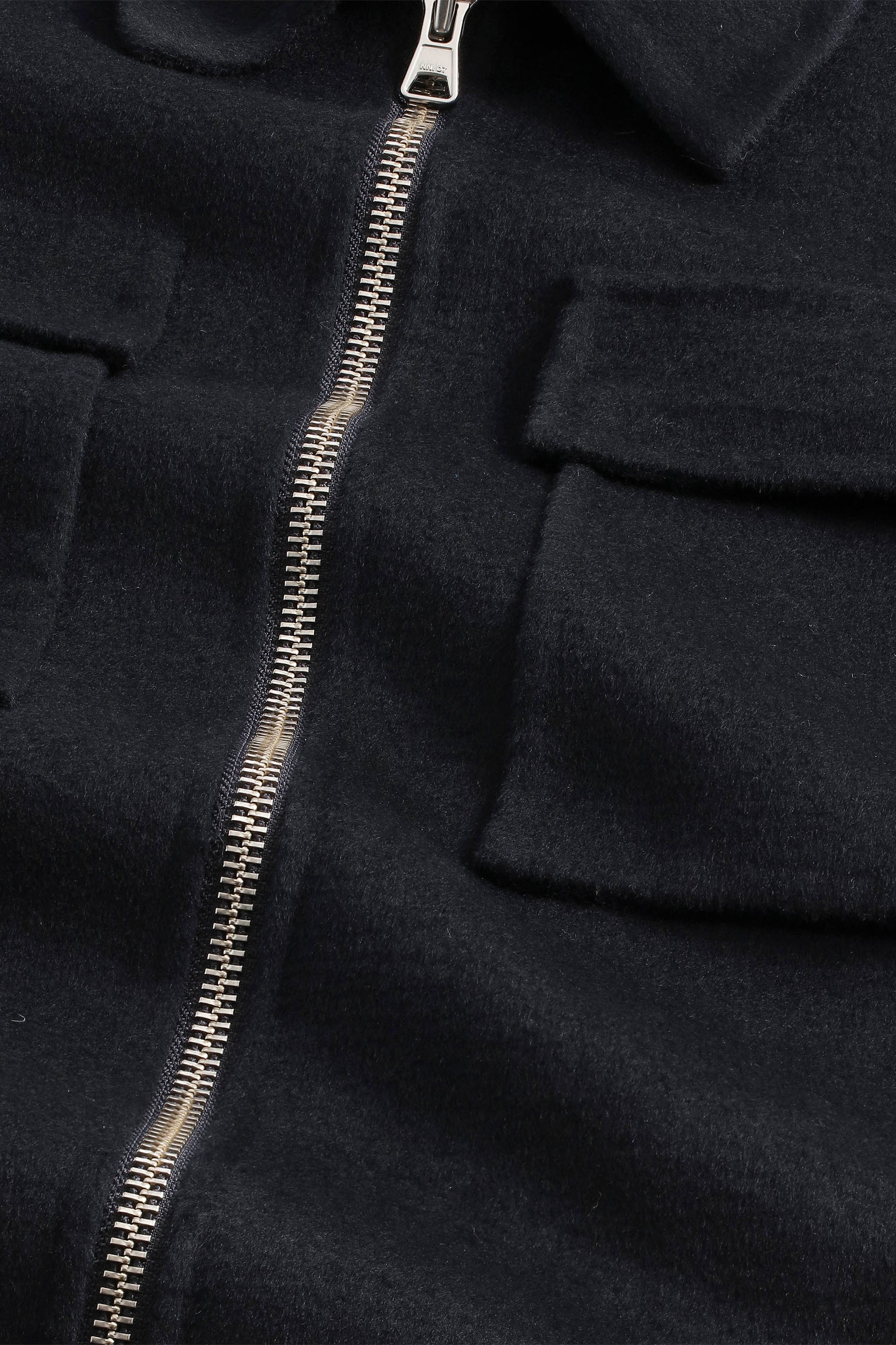 Brushed hip-length jacket crafted from a double faced wool-blend in a plain weave. Features two slanted chest pockets, faux horn buttons and a logo zipper.