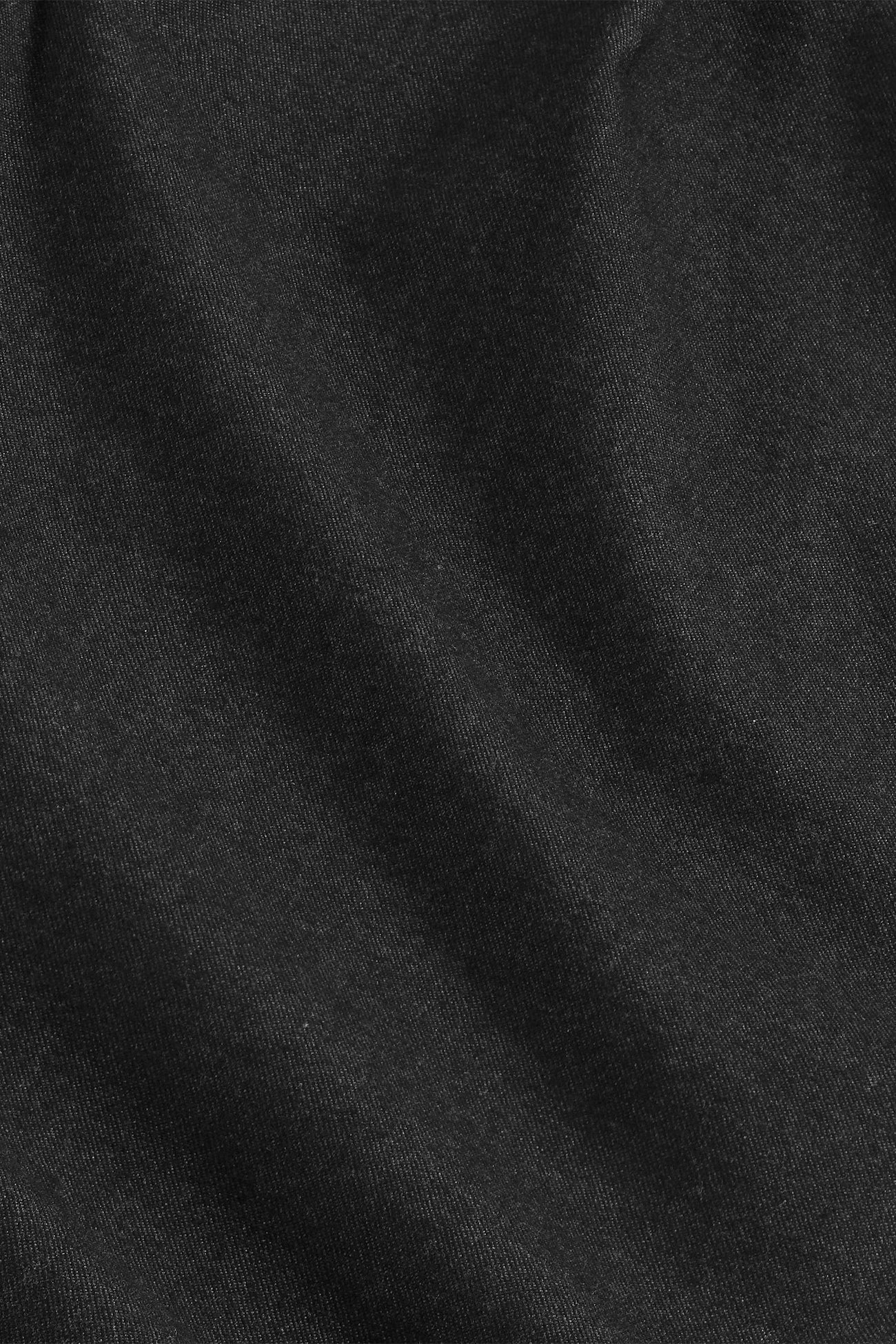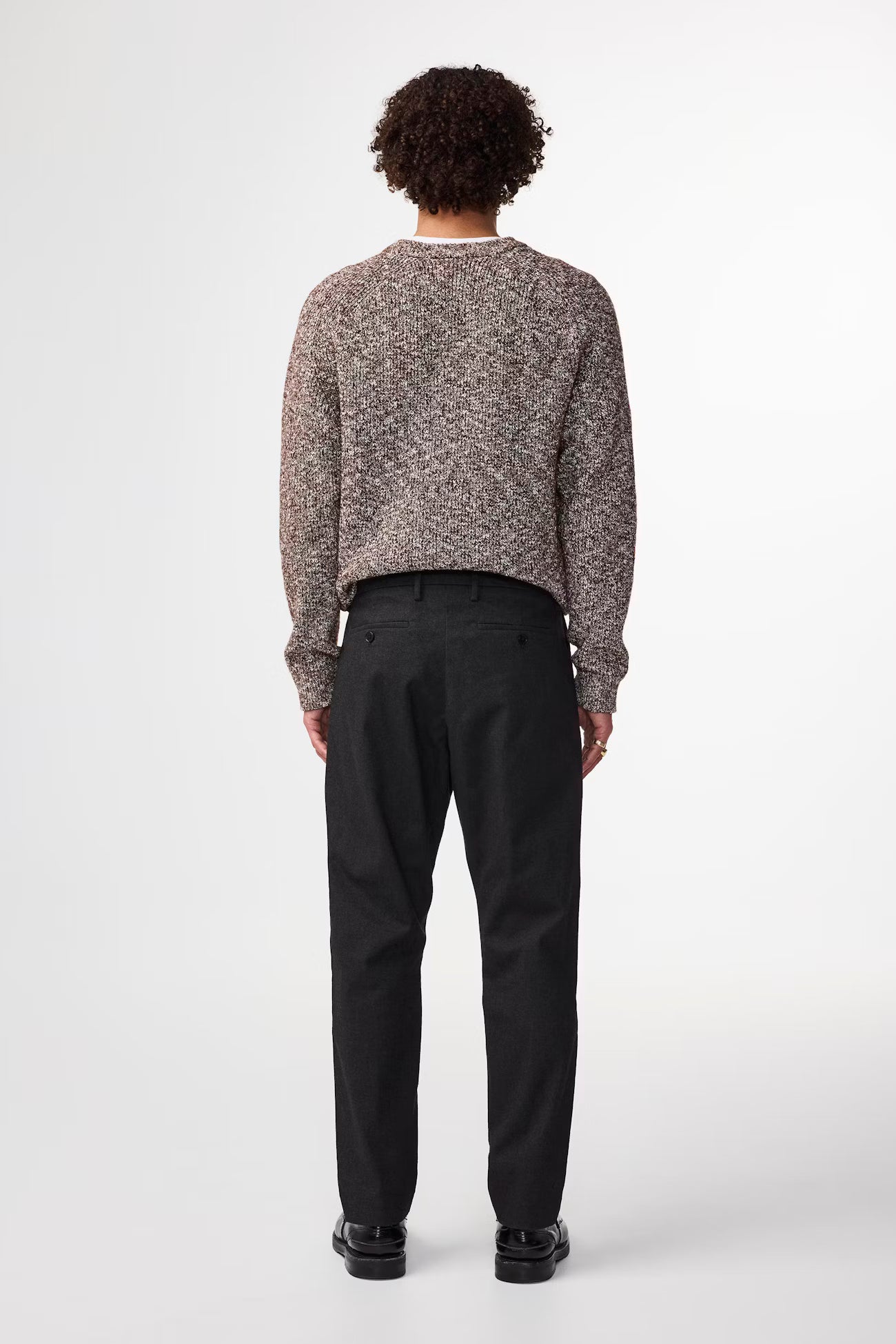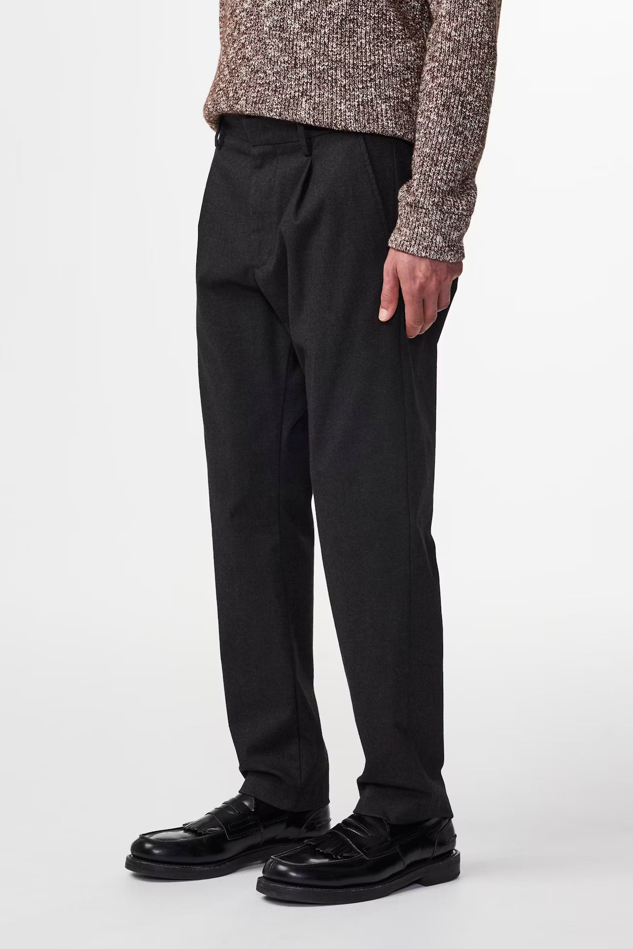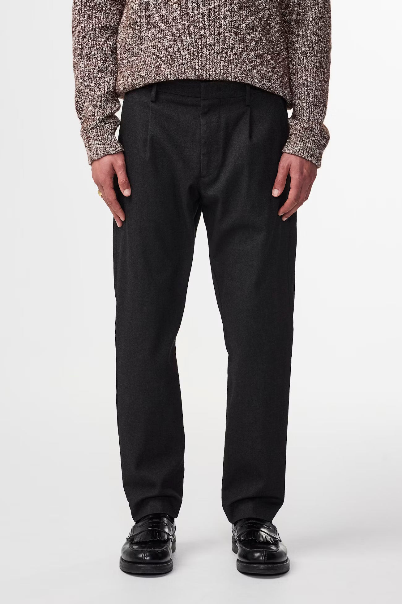 Trousers in a regular fit with tapered legs, crafted in a 279 g/m2 brushed cotton twill melange blend with a touch of stretch for comfort. Features a minimalist design with press folds, blind hem, and hidden closure.
