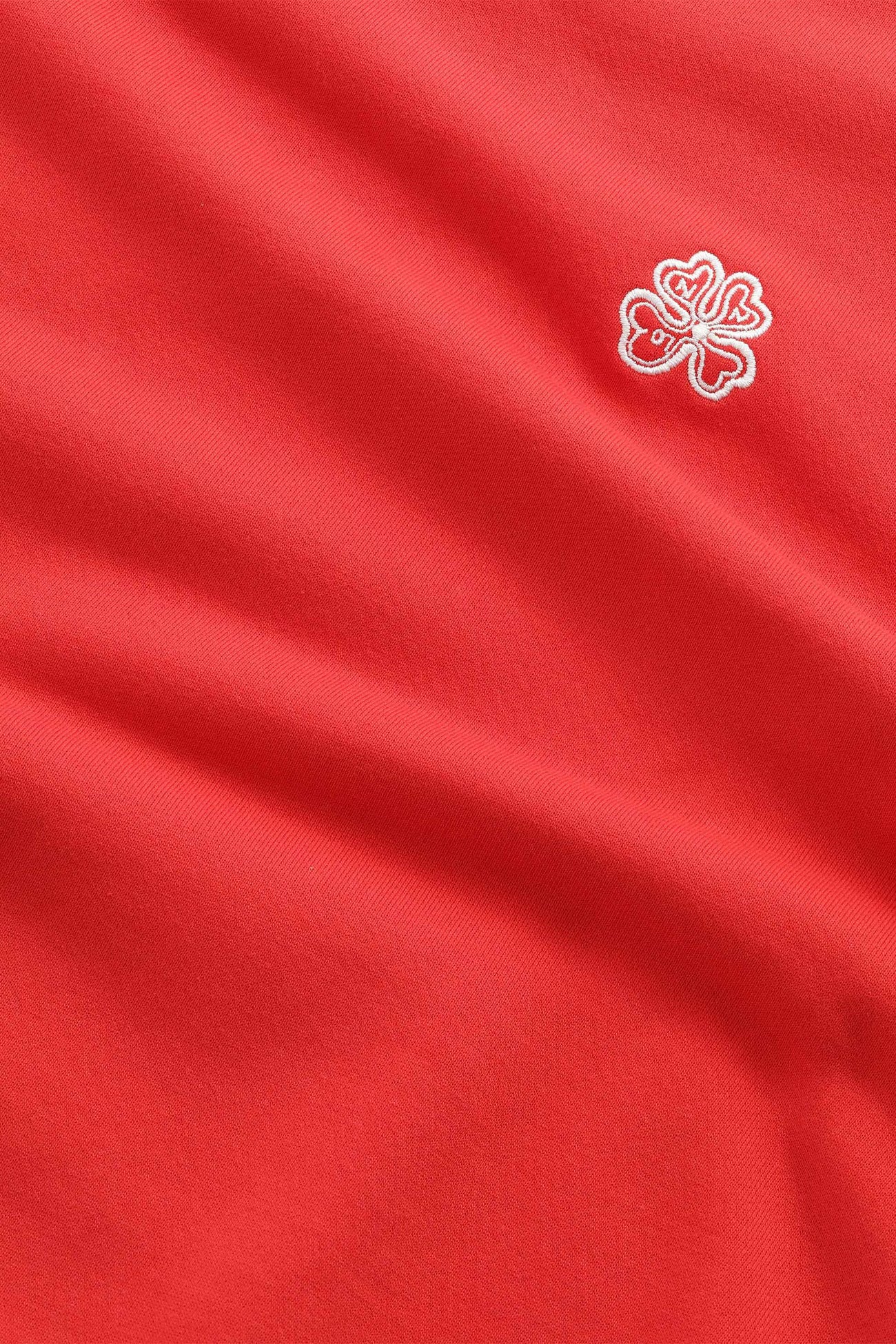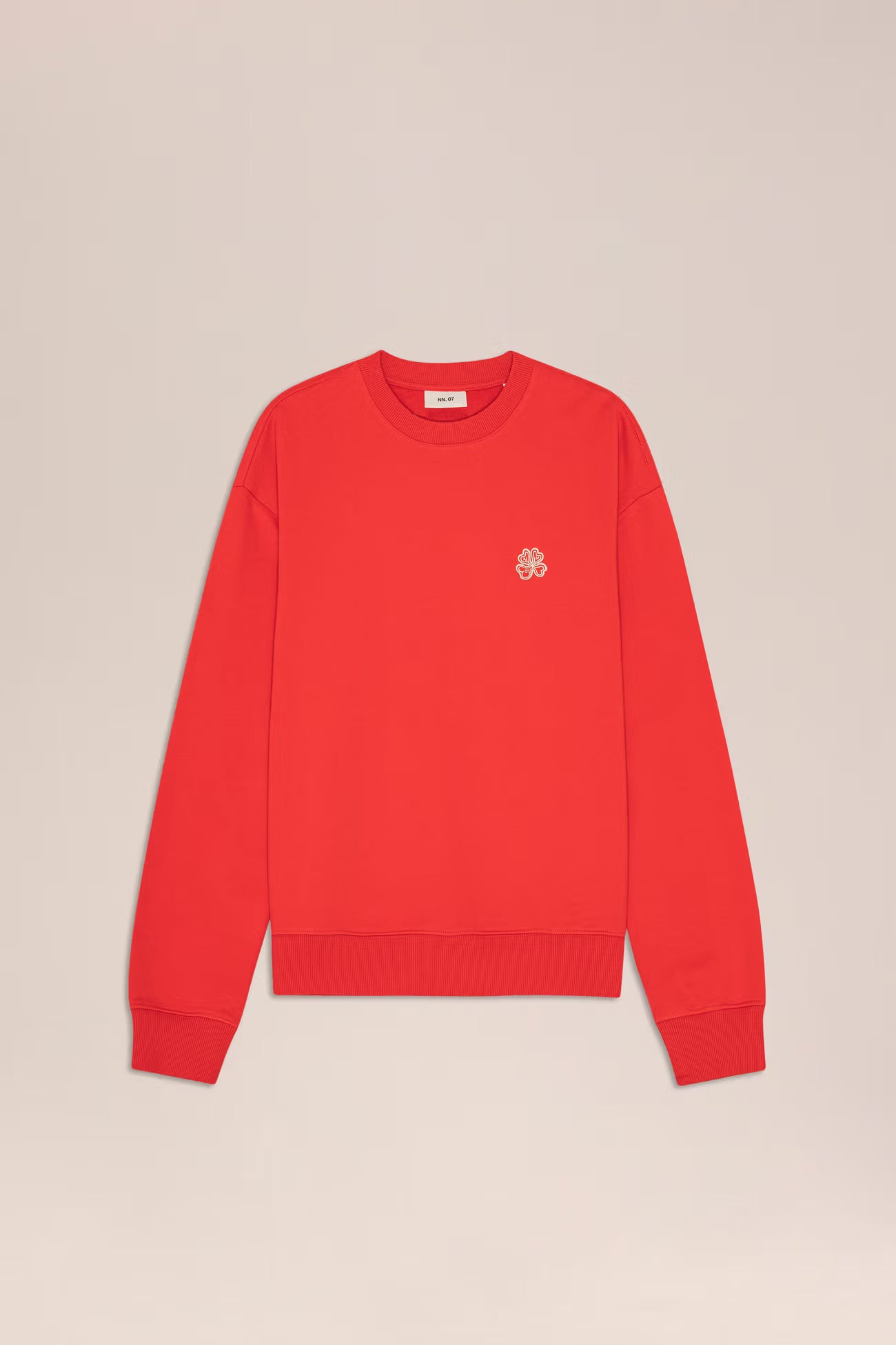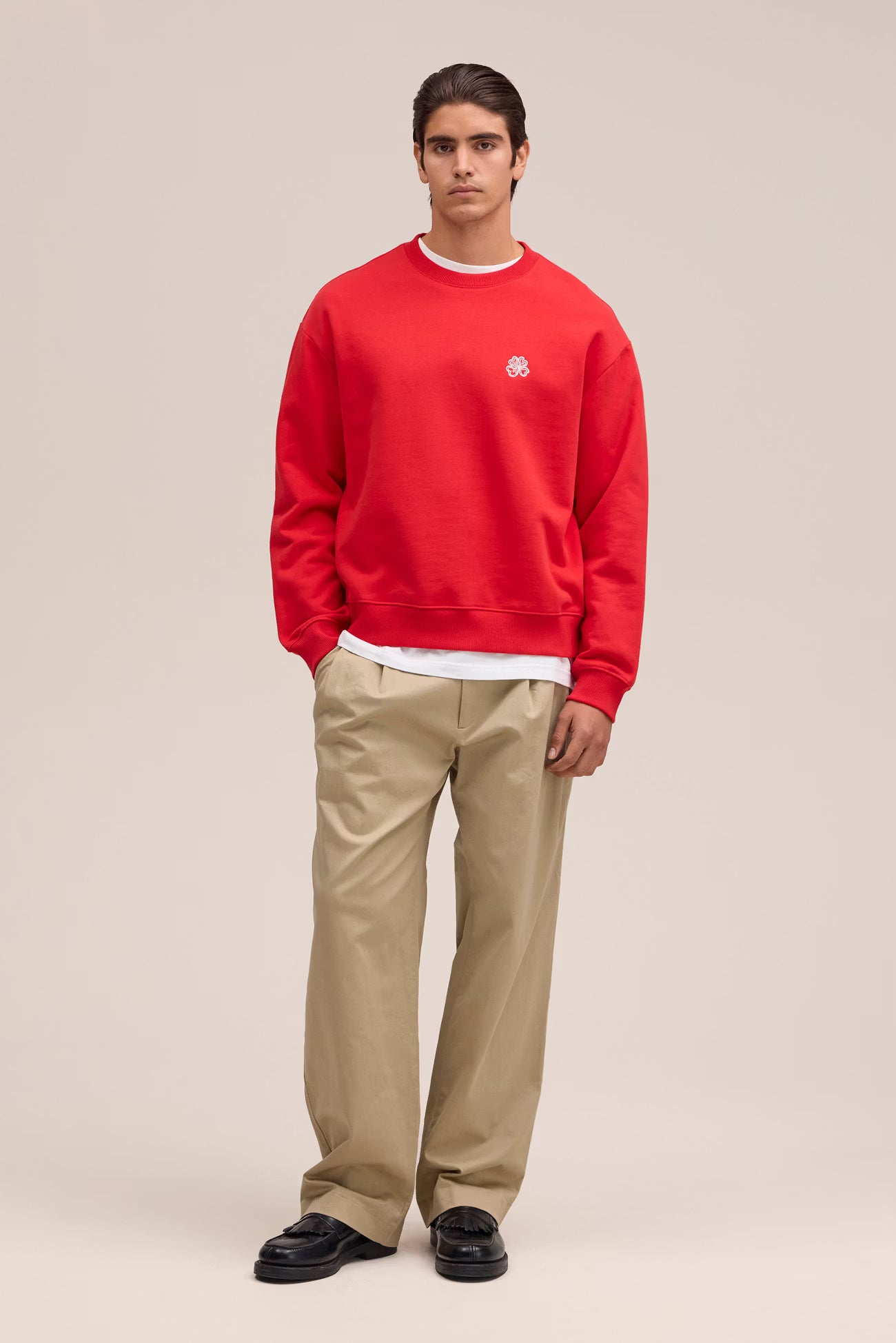 Relaxed-fit crewneck sweatshirt crafted from heavyweight organic cotton with a soft, peachy texture. Features brushed fleece with 2x2 ribbed detailing and a small four-leaf clover embroidery on the chest.