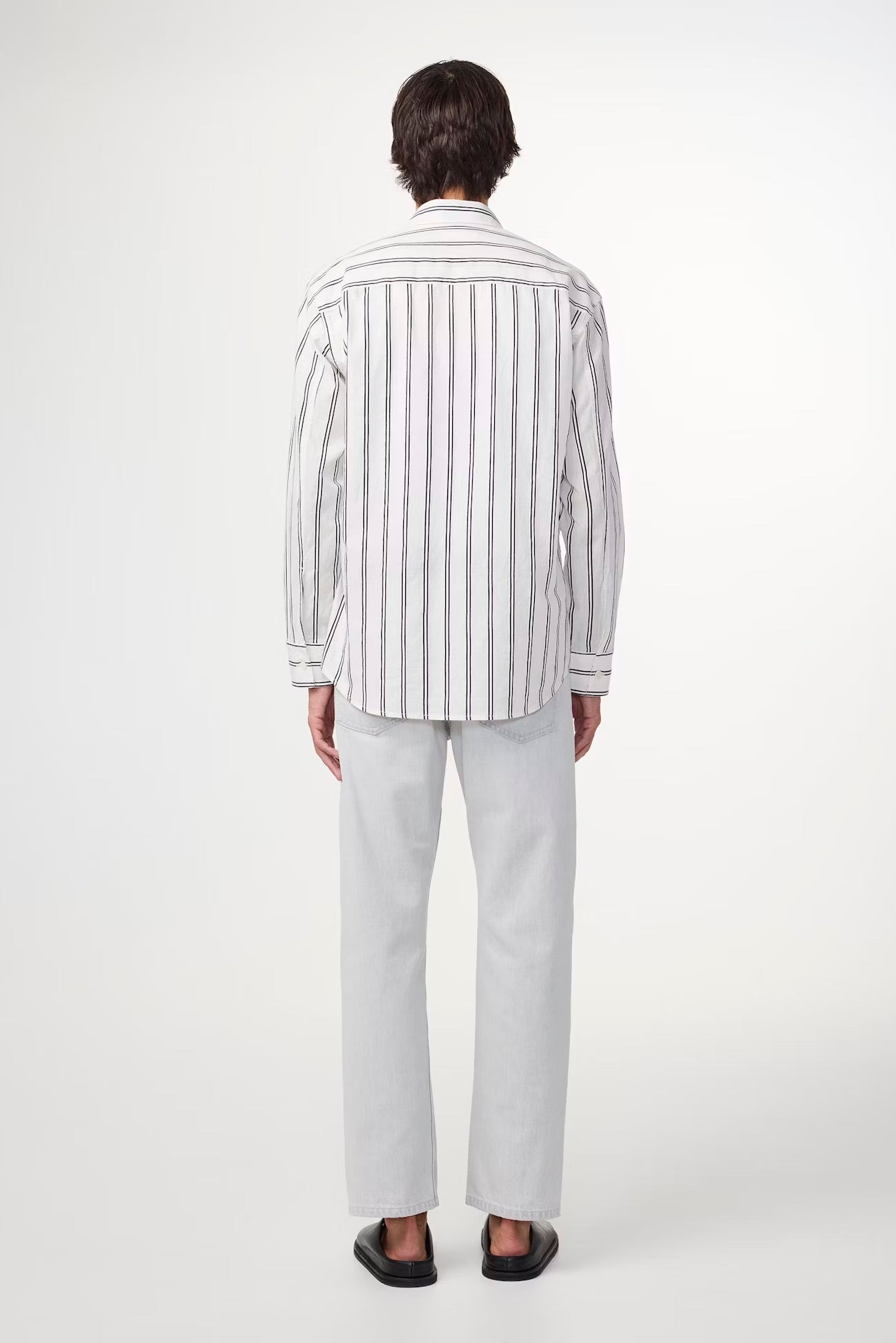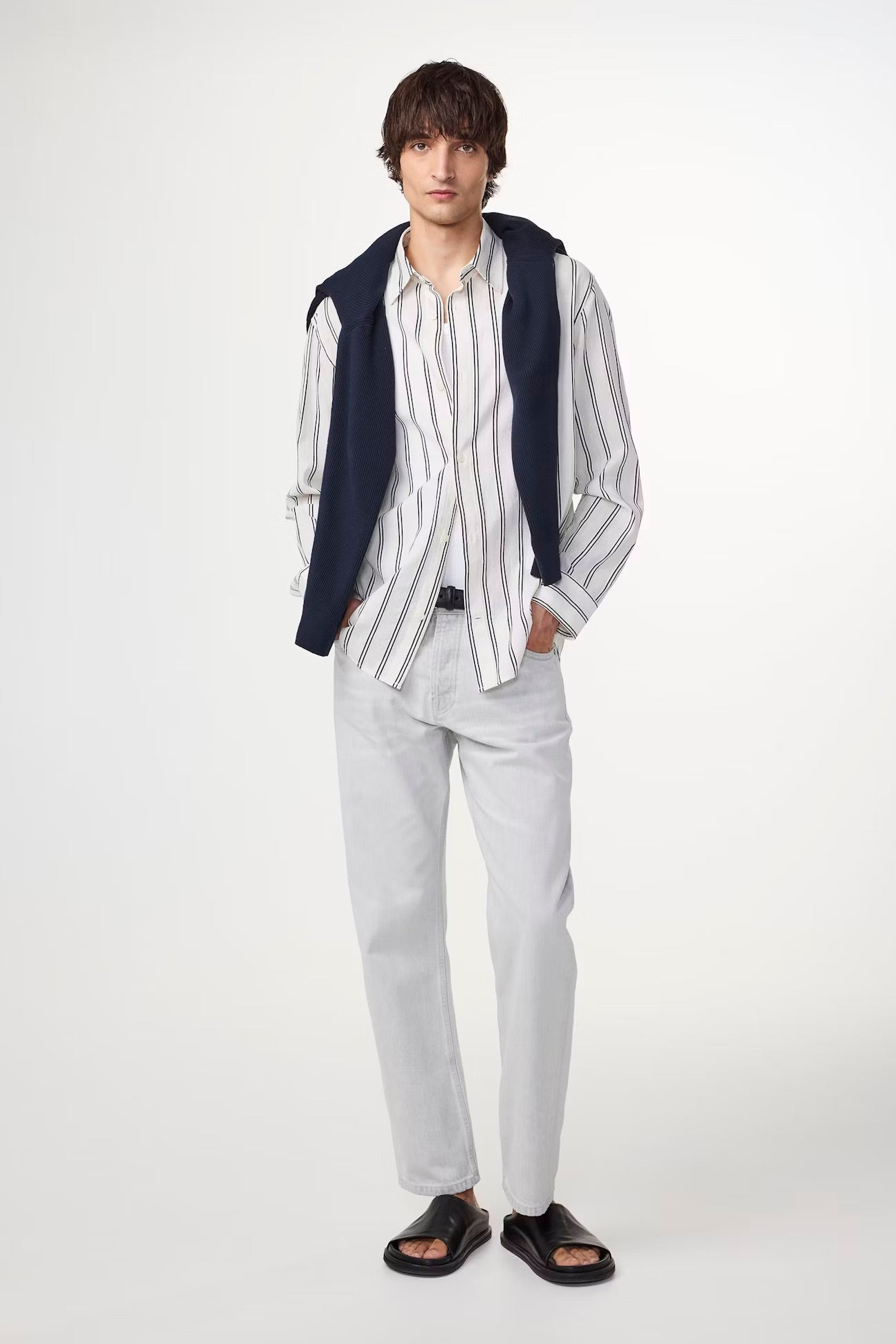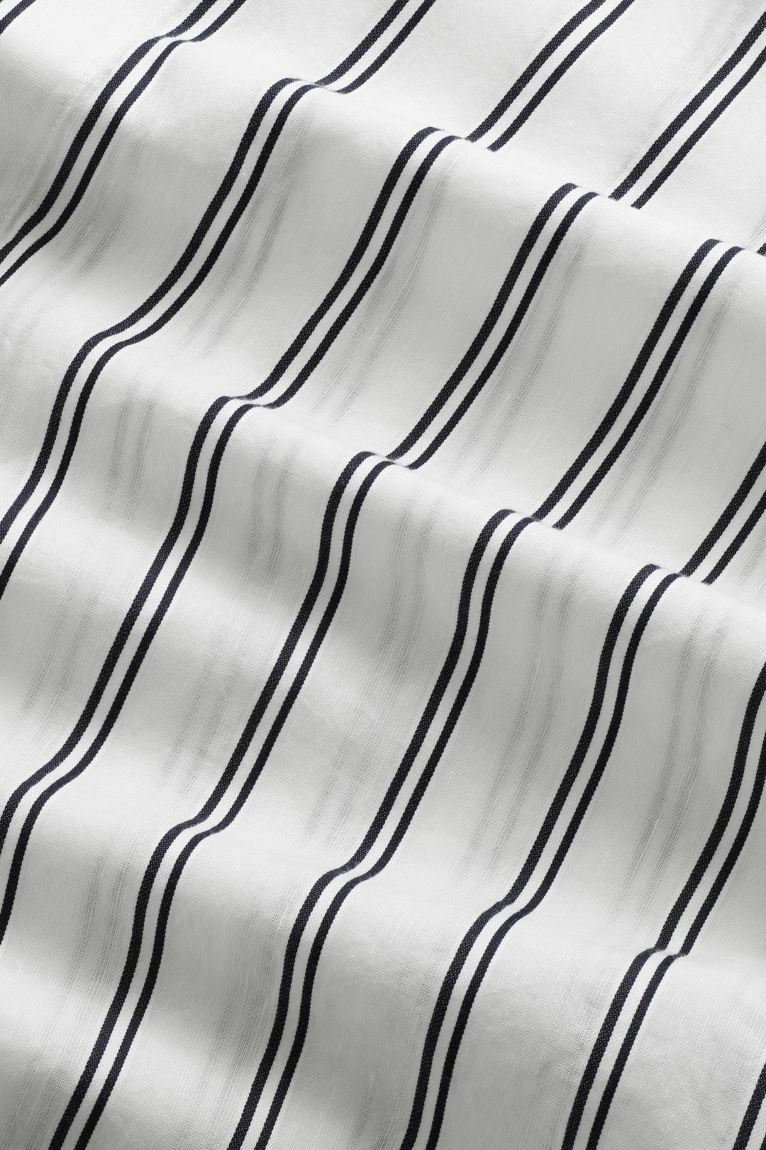 Striped shirt made from a satin weave cotton and linen blend fabric, designed with Mother-of-Pearl buttons.