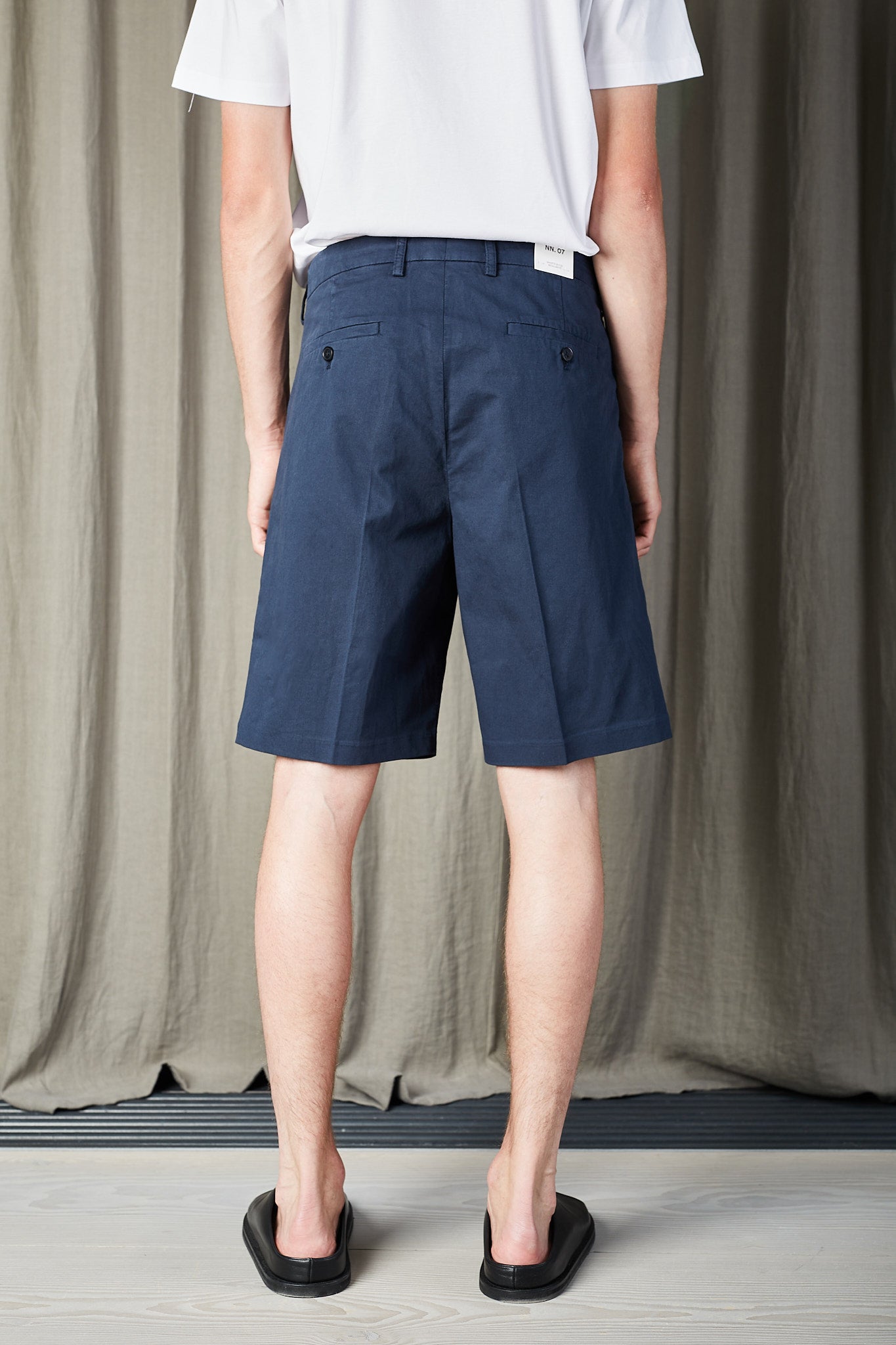 A pair of pleated poplin shorts crafted in organic cotton and linen blend with a garment dyed finish.
