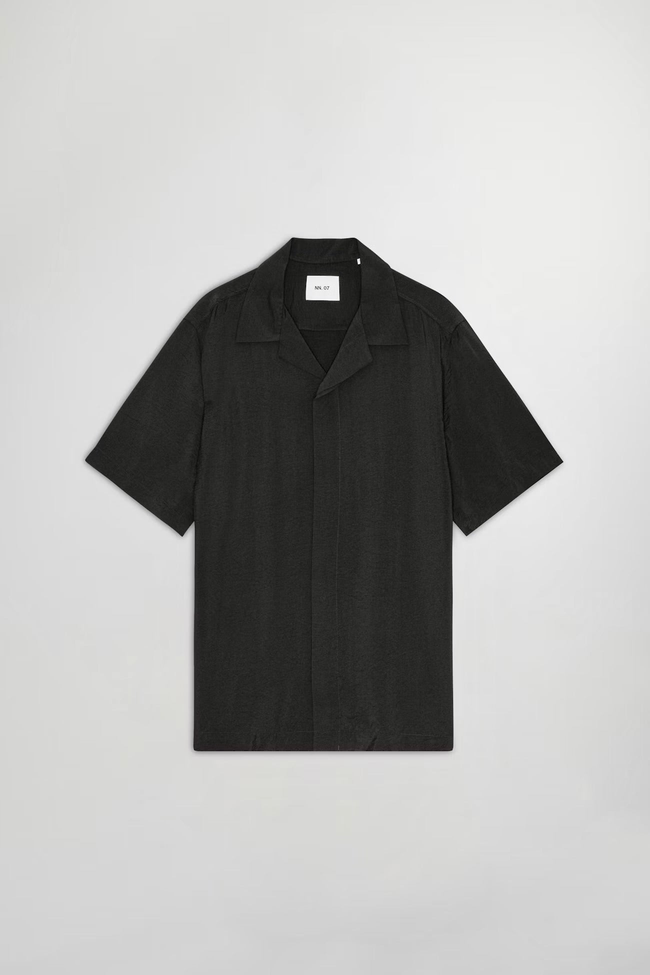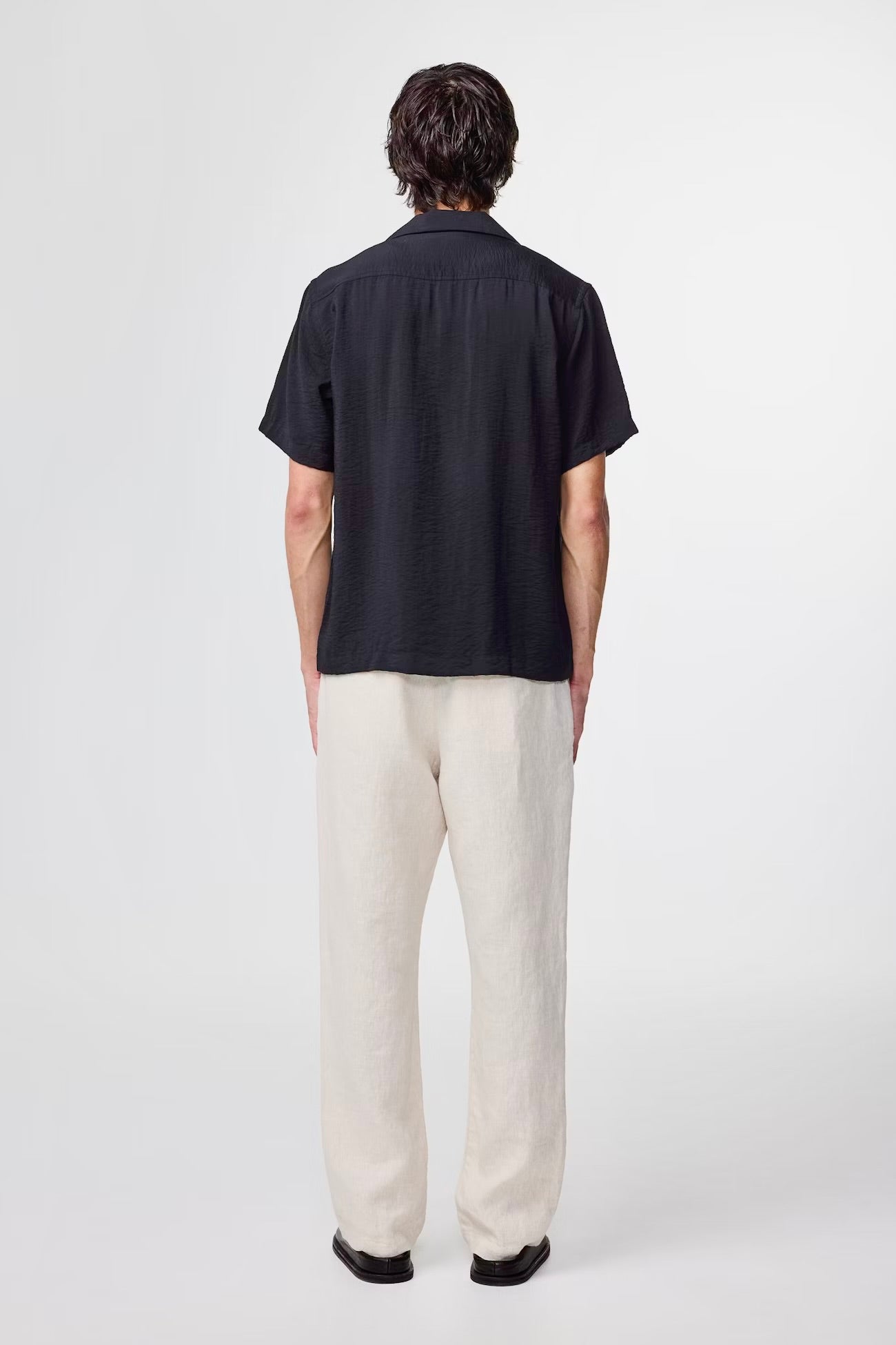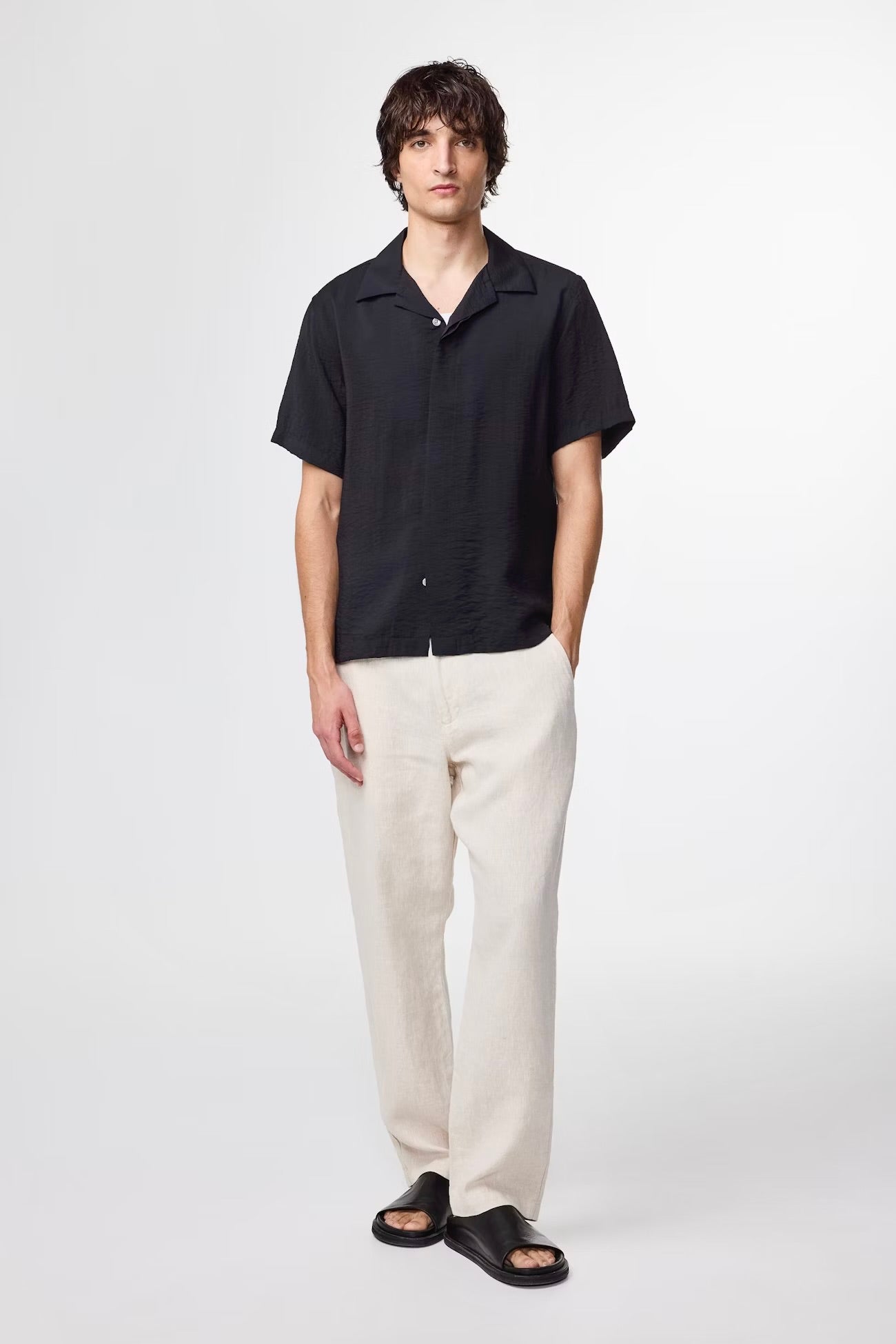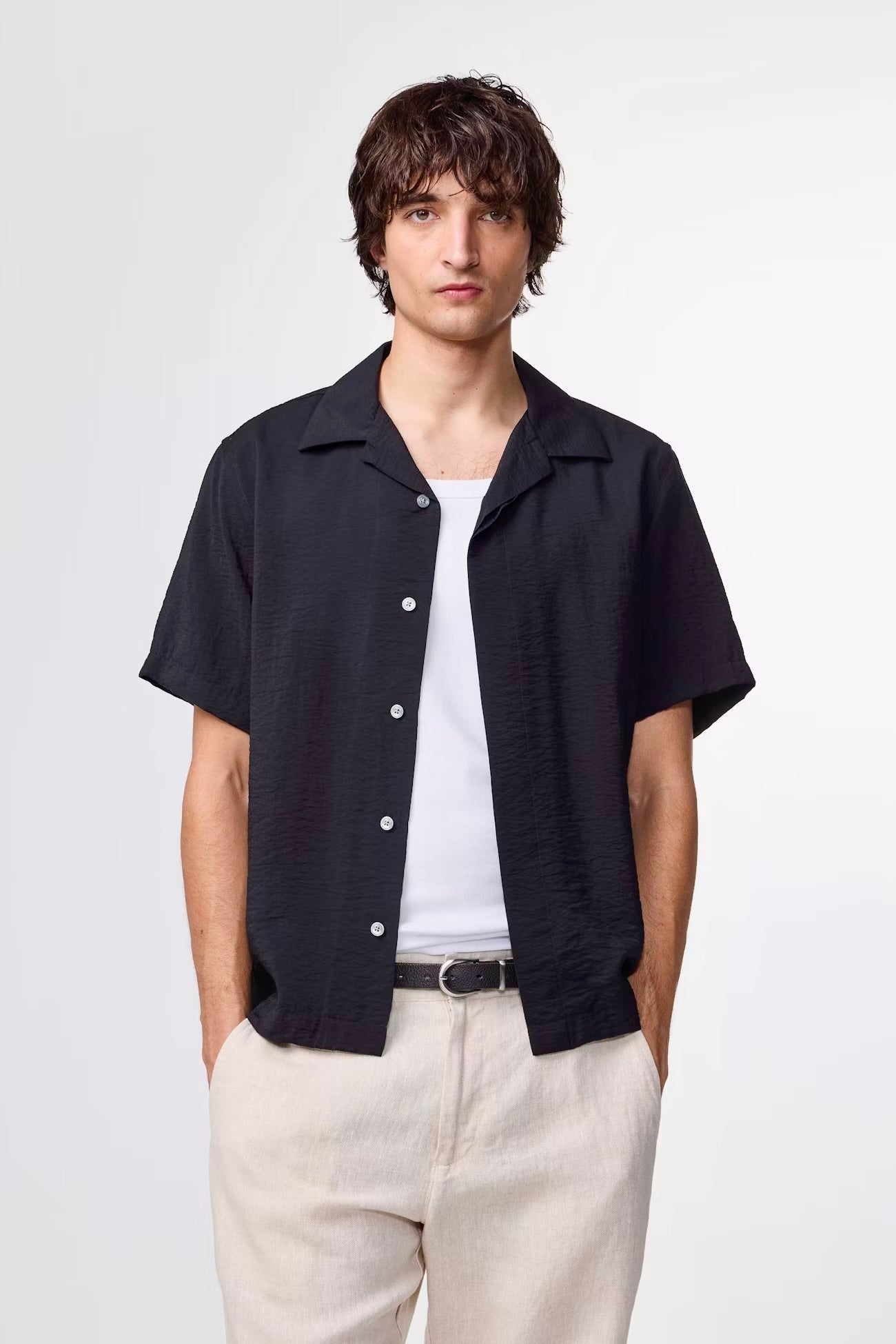 Loose-fitting short-sleeve shirt in a pebble textured twill fabric crafted from a TENCEL™ lyocell blend, designed with an open collar and hidden buttons at the placket.
