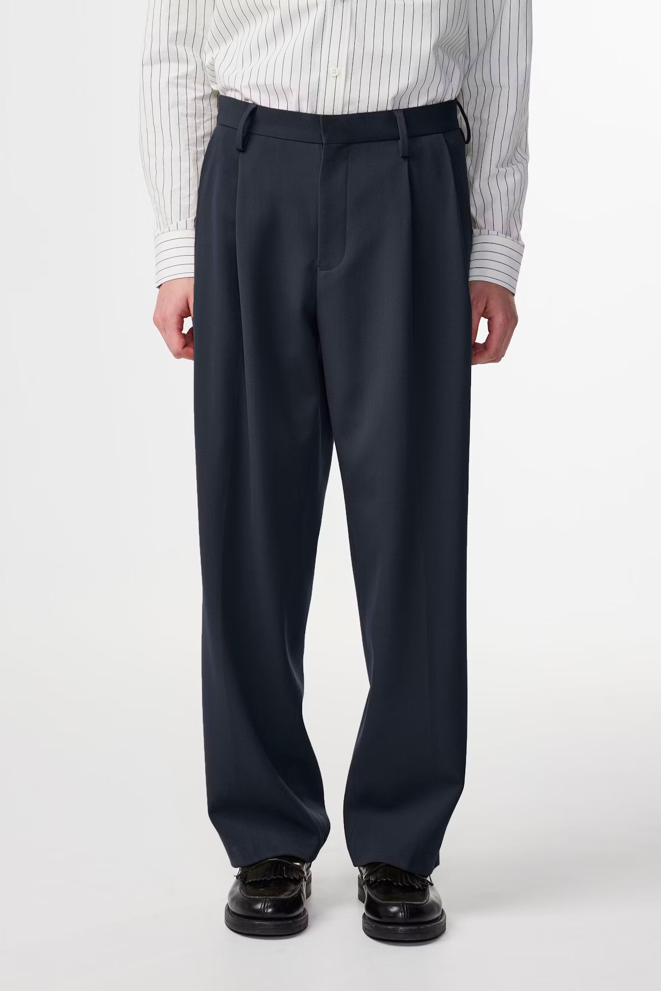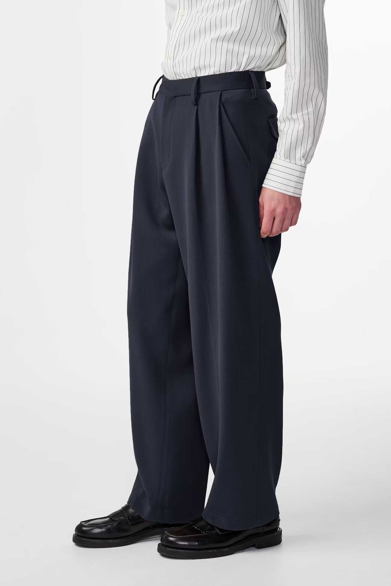 Sophisticated dress trousers in a relaxed fit with a wide leg and double pleats at front. Made from 550 g/m² certified wool blend in a herringbone weave with a brushed finish. The trousers have a soft handfeel and are finished off with buckle details at the waistband for adjustments for extra comfort.