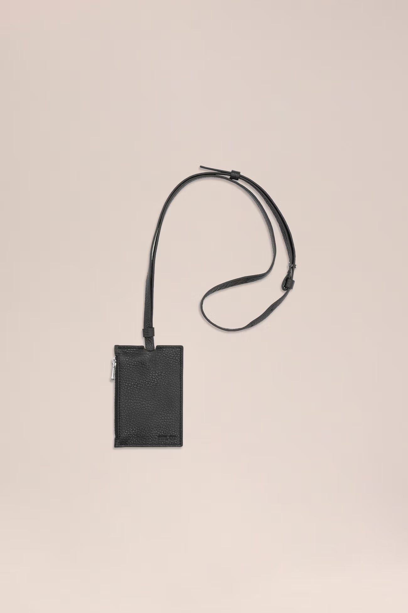 Compact keyring pouch crafted from grain leather with a soft, textured feel and pigmented finish. Features a zippered key storage compartment with attached key ring, manually adjustable leather lanyard strap, and two vertical card slots on the back. Completed with an embossed NN.07 logo on the front.