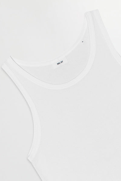Tank top made in an organic cotton blend with a touch of stretch. Designed in a 2x2 rib fabric with single jersey bindings on the neckline and armholes.