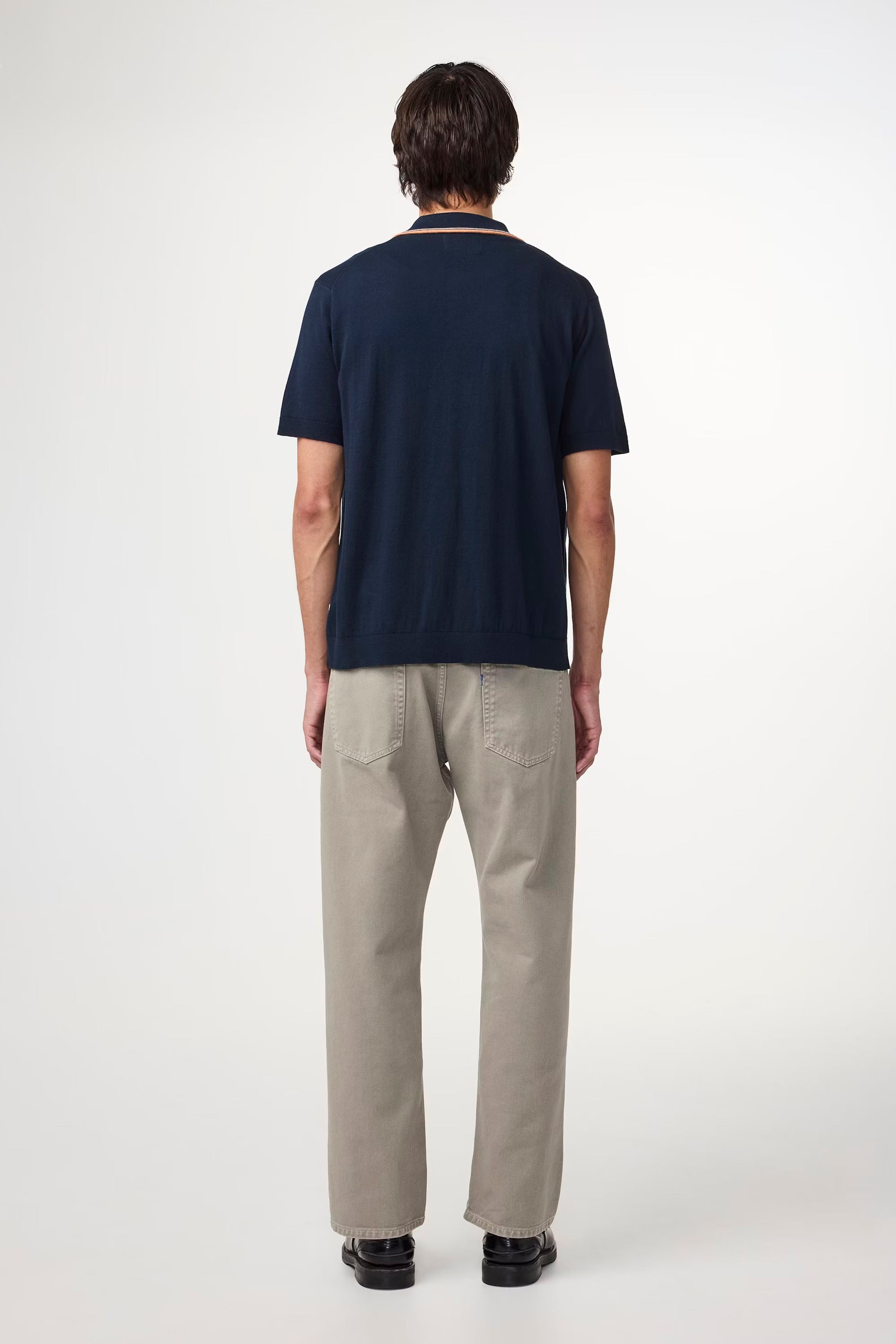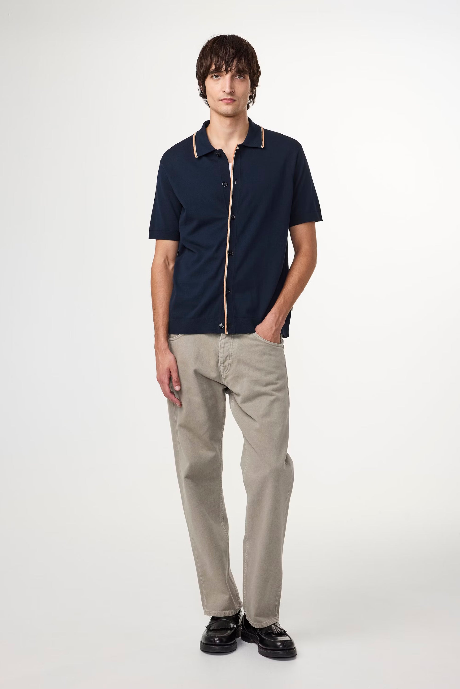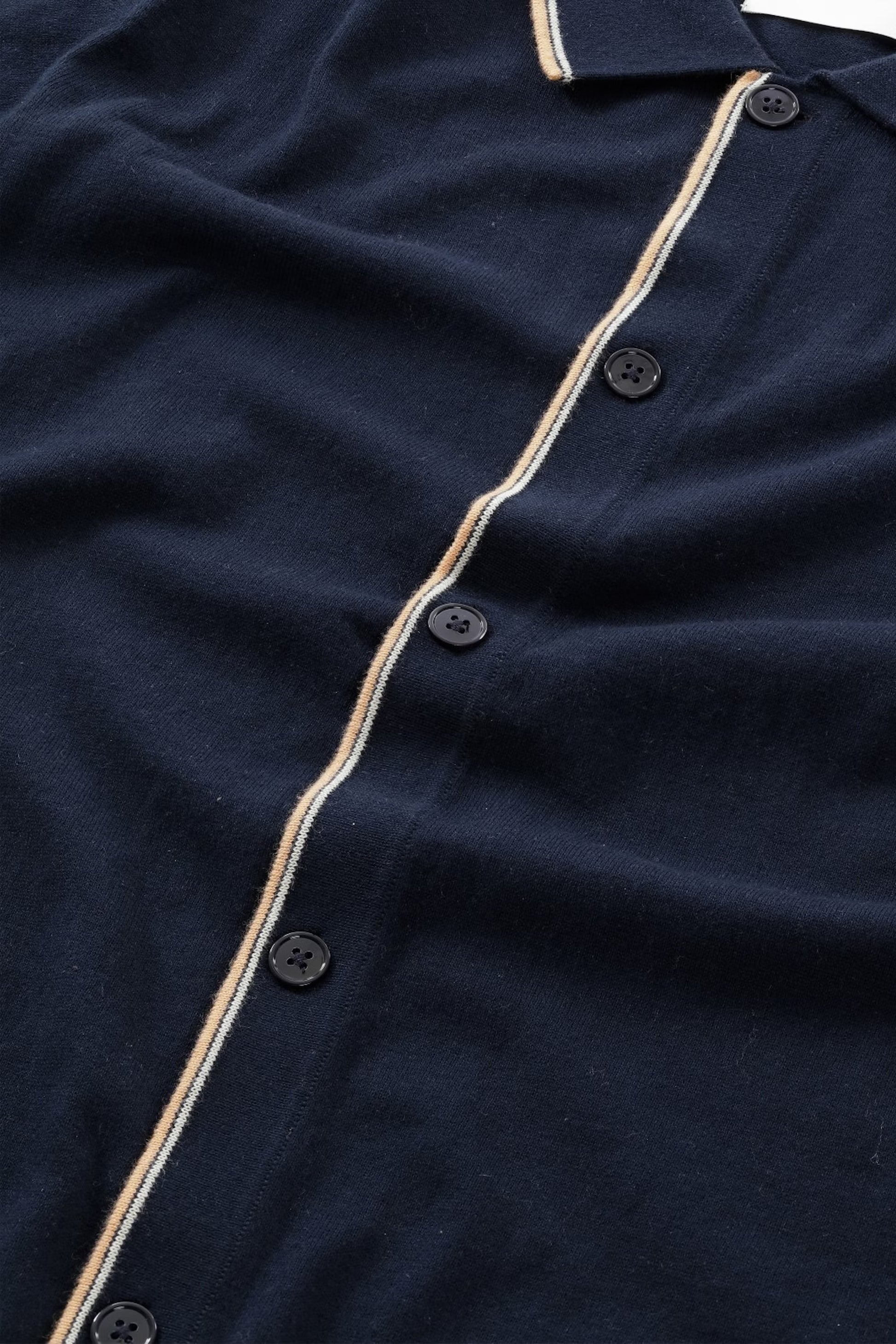 Knitted polo crafted in fine organic cotton yarn. Features button-up front with Mother-of-Pearl buttons and classic polo collar.
