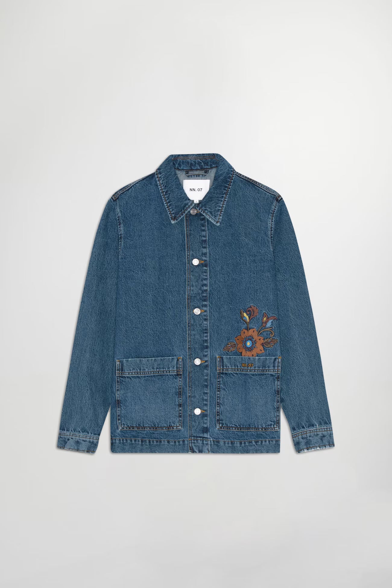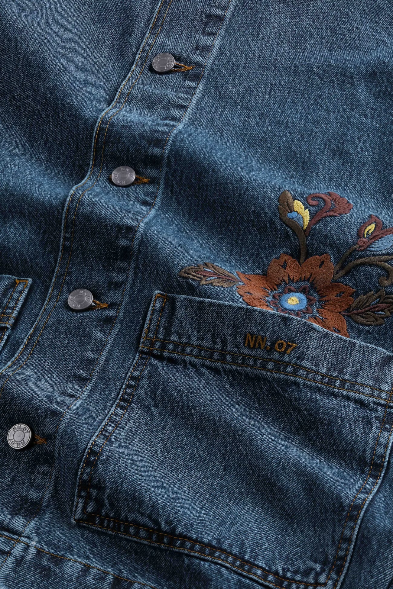 Heavy hybrid jacket crafted from a rigid organic cotton denim designed with hand pocket and jeans buttons. Featuring a flower embroidery above the pocket.