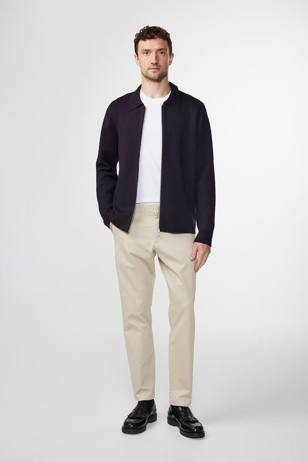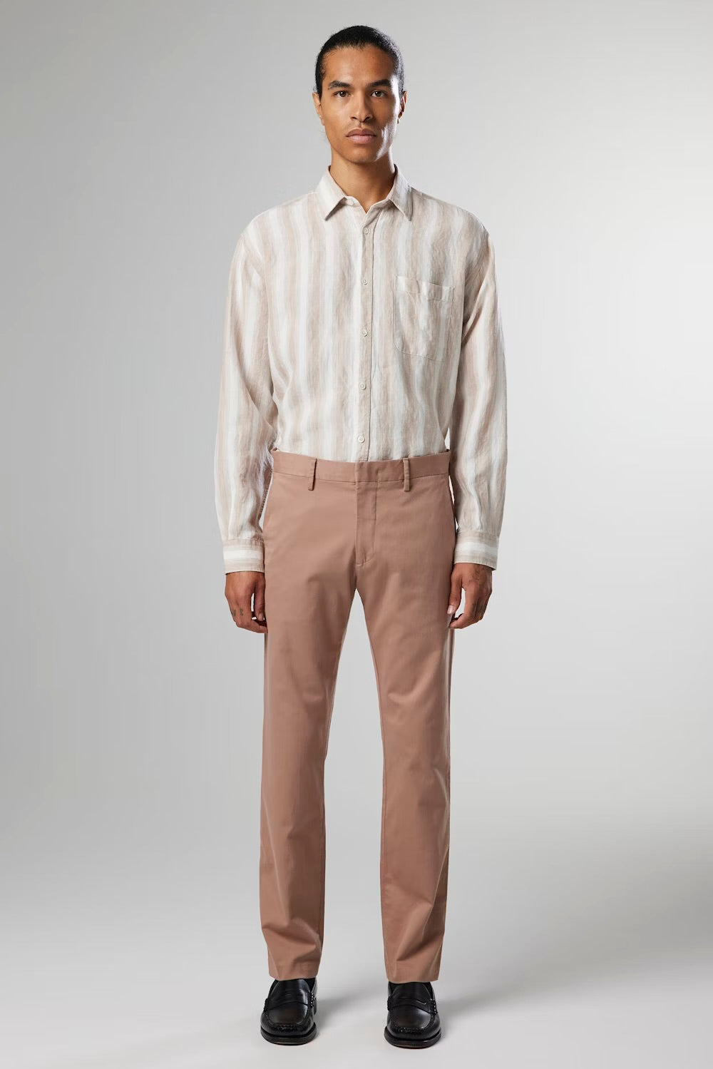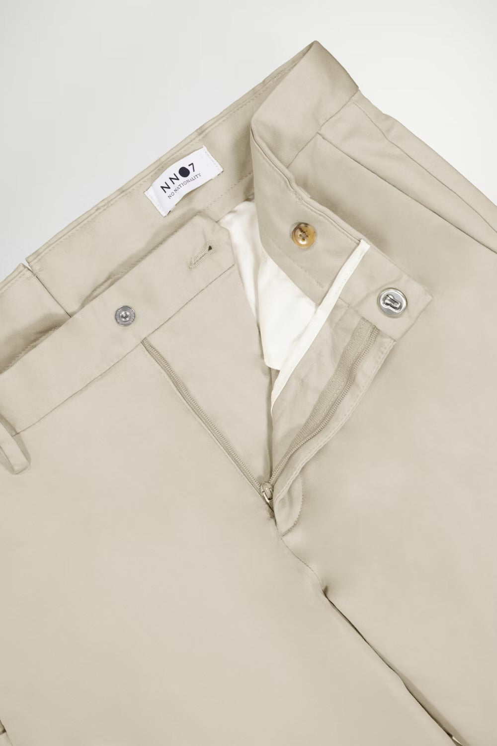 Versatile trousers crafted in a soft organic cotton blend. Features a crisp crease and blind, finished with a metal top button and zip-fly closure.