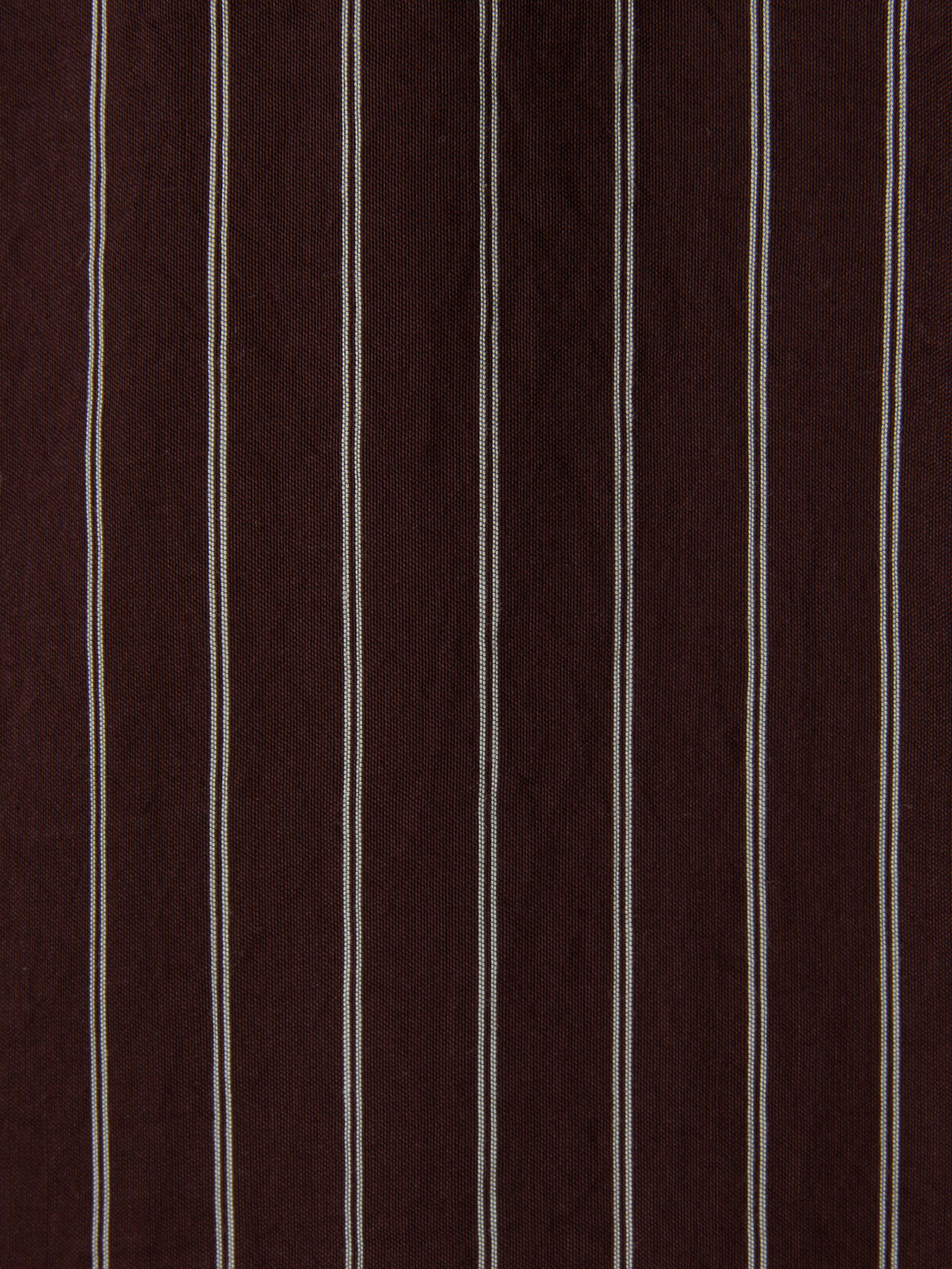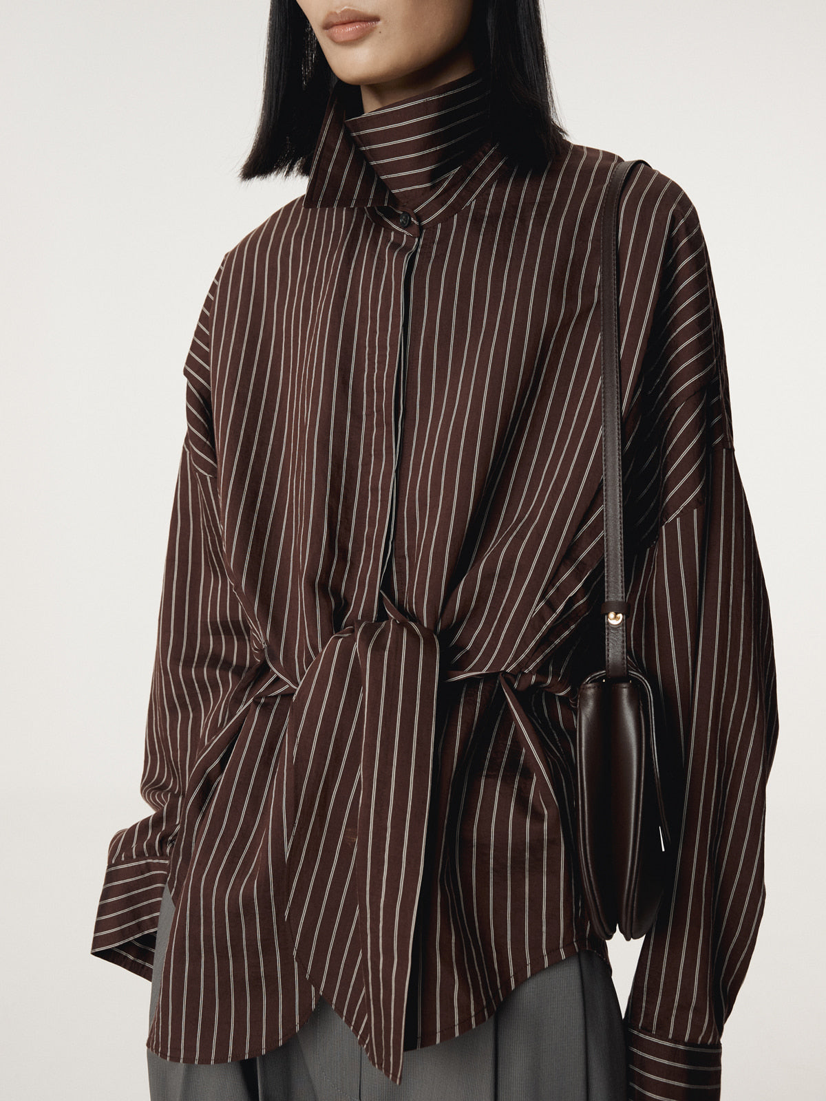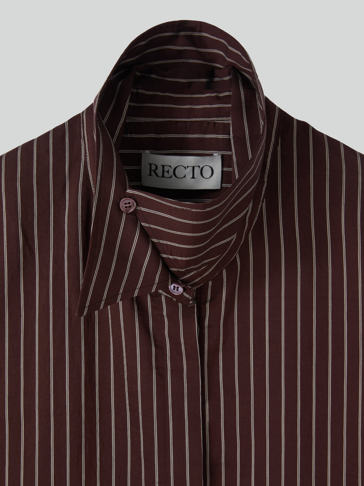 The RECTO Double Layer Stripe Shirt features a fluid, cellulose-blend fabric crafted in Japan, combining sustainability with exceptional quality. Designed with a relaxed fit and a voluminous silhouette, it presents a double-layer front with a tie-able detail for versatile styling. The buttoned collar and precise tuck and seam lines enhance its tailored appearance, making it a sophisticated addition to any wardrobe focused on refined comfort and eco-conscious materials.