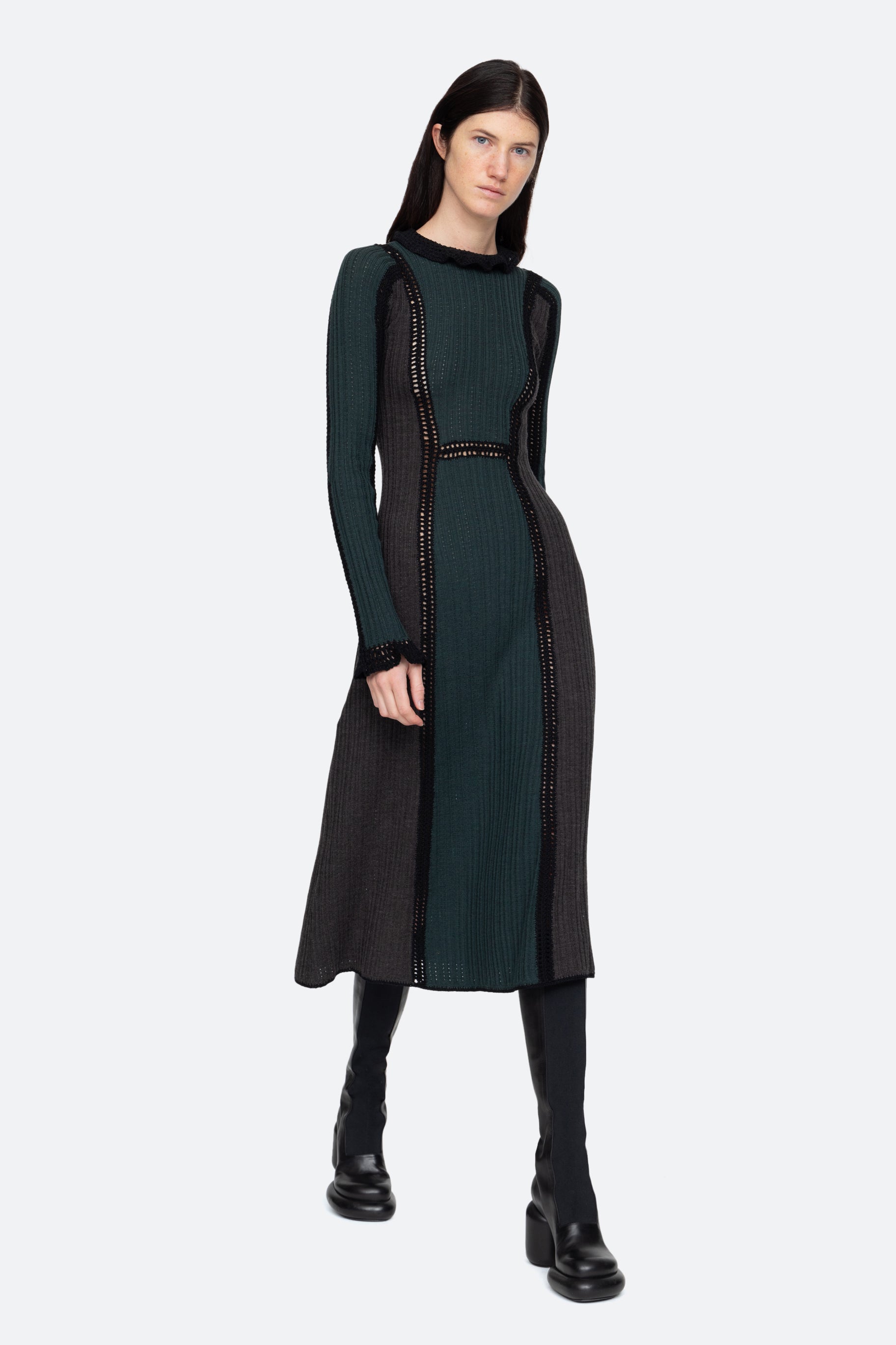The Riva ribbed knit turtle neck dress features hand crochet detailing on the cuffs and neckline.