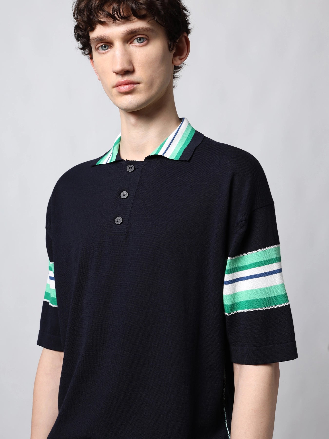 Pure cotton polo shirt, characterized by color block stripes on the sleeves and collar. The item has an oversize fit, a button-down collar, contrasting side seams and clean finishes.