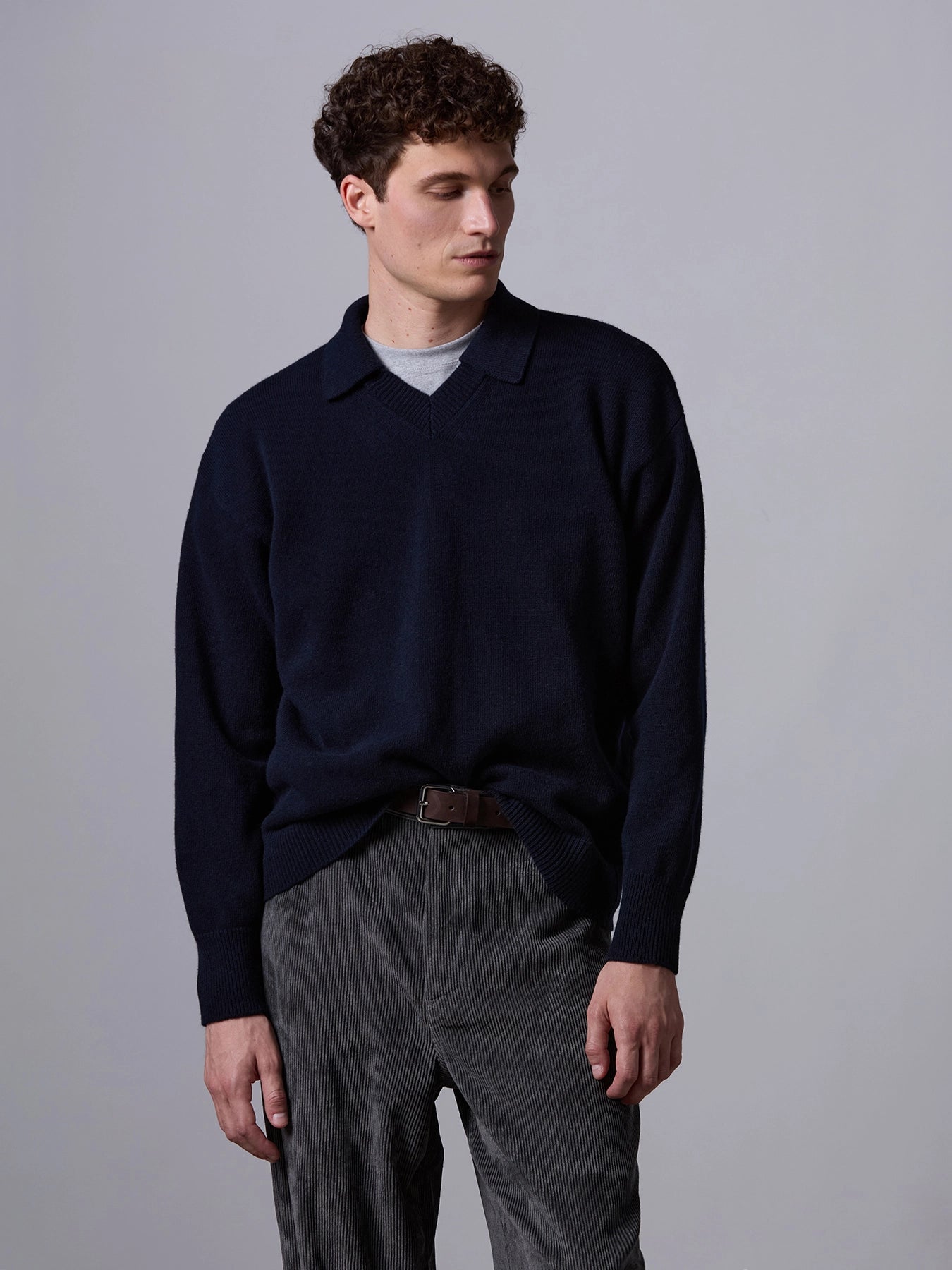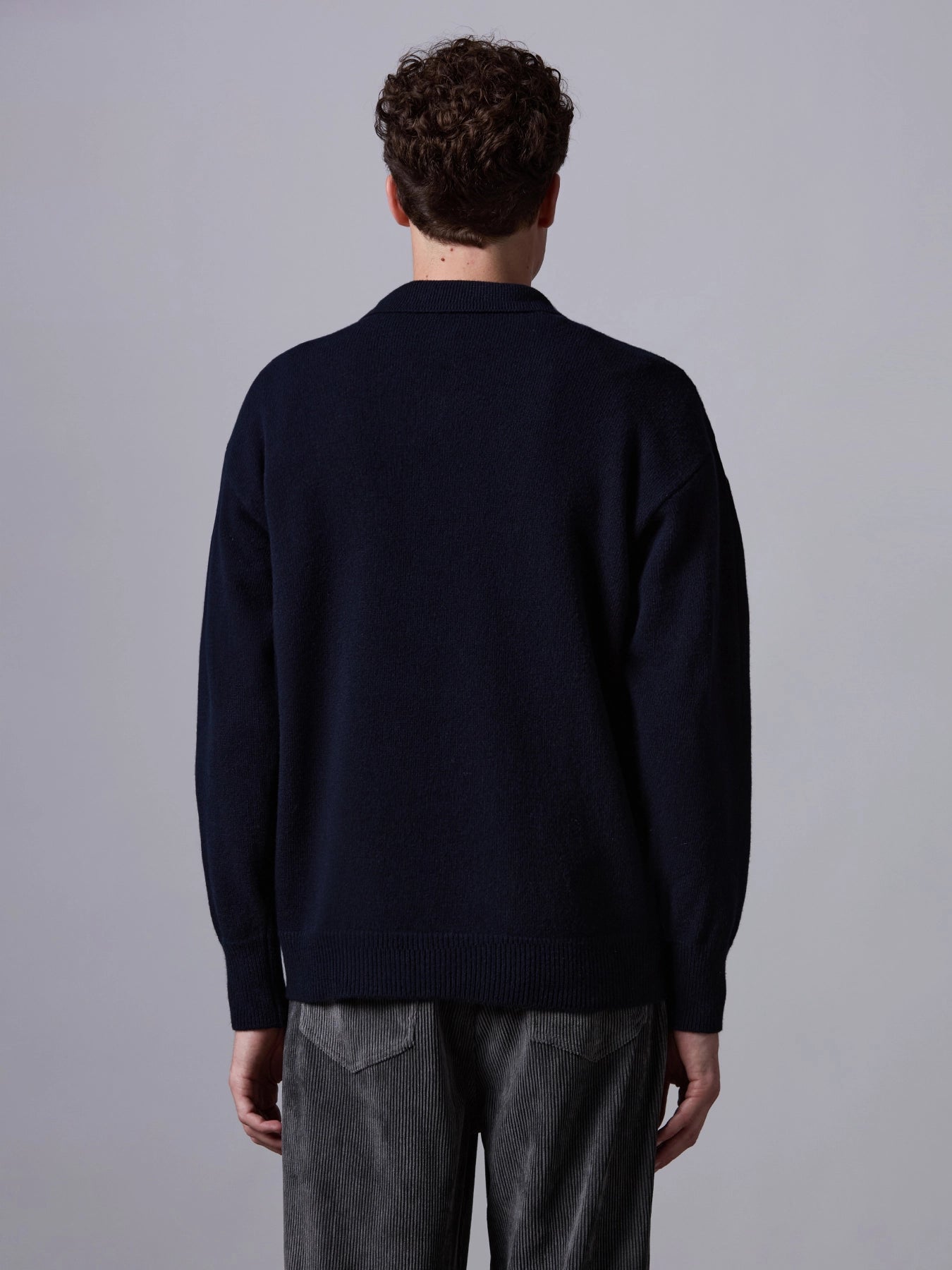 Relaxed-fit polo crafted from a soft blend of wool and cashmere. Finished with ribbed hem and cuffs, and a V-neck with a buttonless polo-style collar