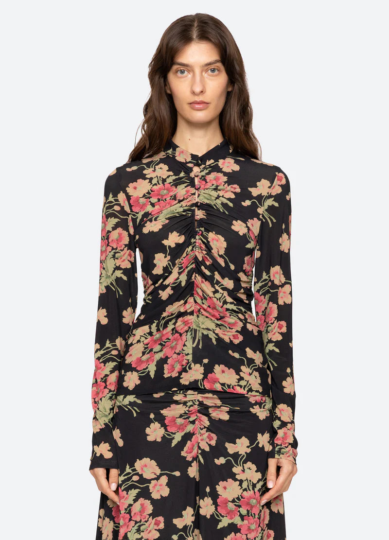 The Cornelia floral print long sleeve top is designed with a high neckline and detailed ruching along the front and back, creating a flattering, softly gathered silhouette. Its long sleeves and romantic print lend an effortlessly polished finish.