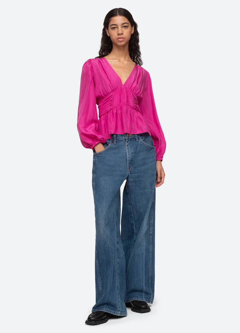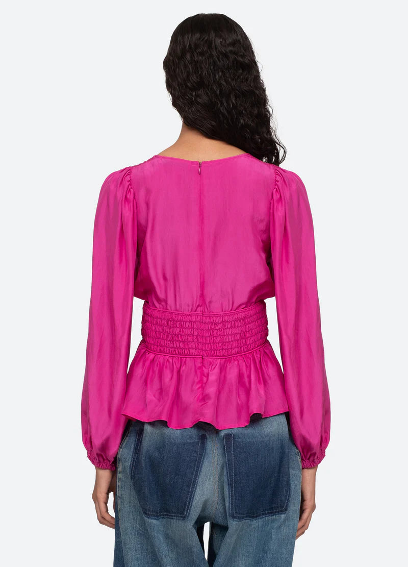 The Fabiola silk habotai top features a v-neckline, long puff sleeves and ruched and smocked detailing.