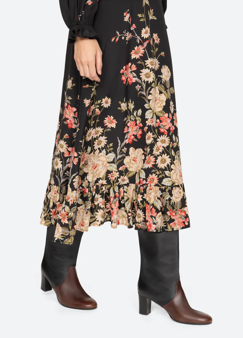 The Jolie floral print dress features a flattering midi silhouette with long puff sleeves and a delicate neck tie adorned with tassel charms. A soft ruffle hem adds a playful touch, enhancing its romantic and feminine appeal.
