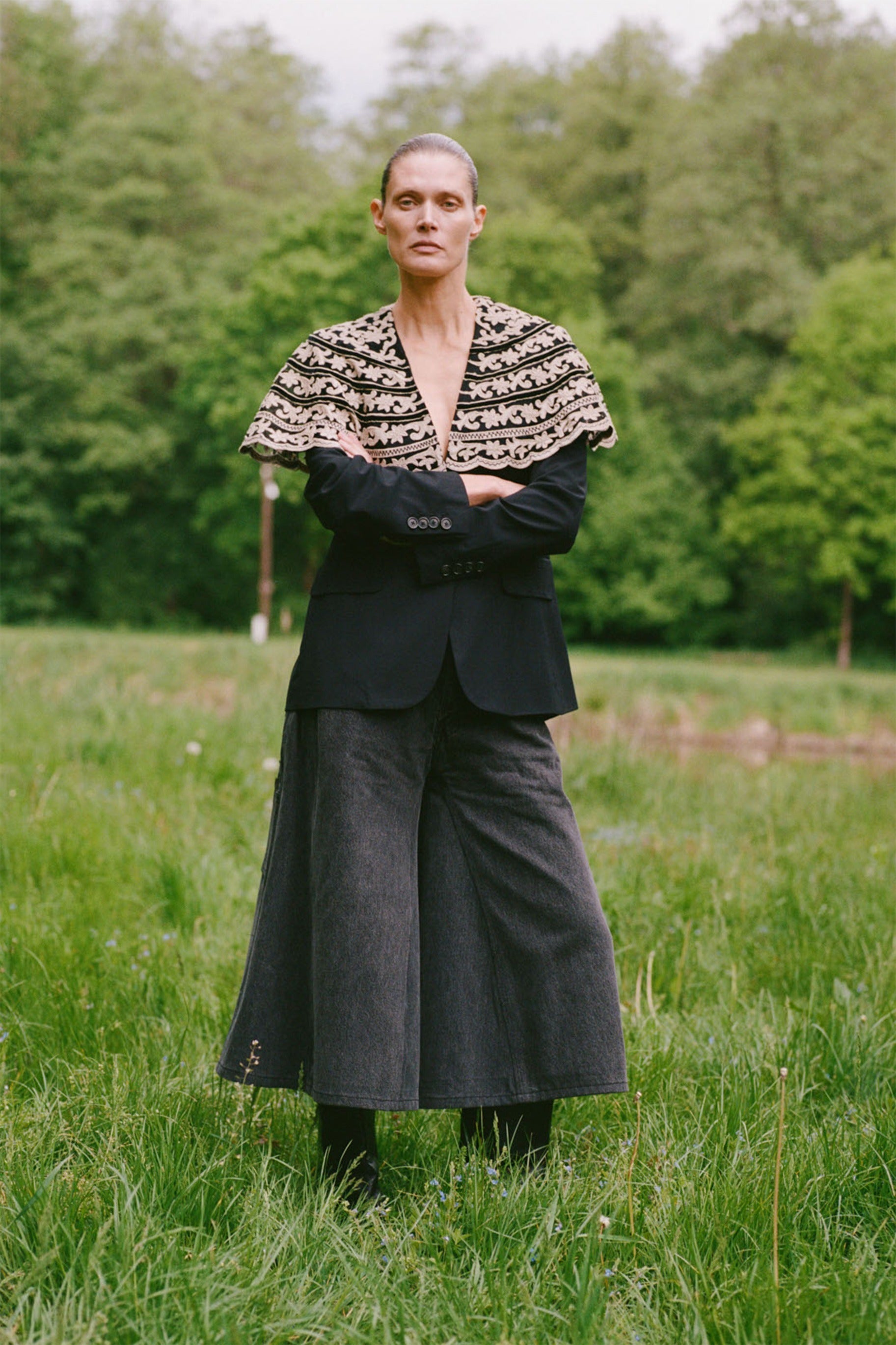 The Lyssa denim culottes feature a cropped, wide leg silhouette, combining relaxed ease with modern, tailored proportions.