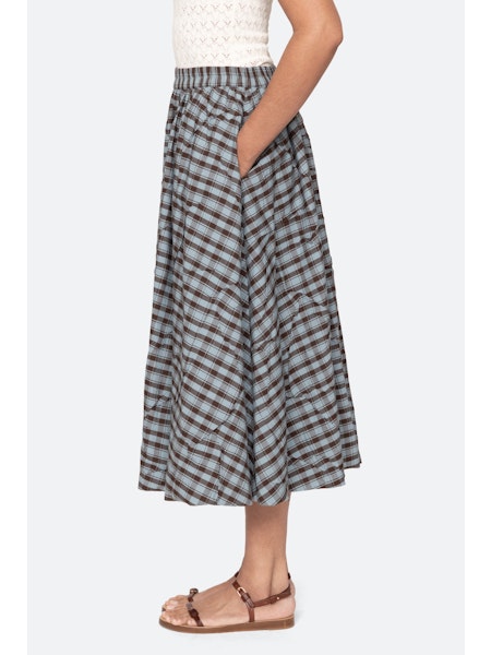 The Ophelia plaid skirt features a timeless midi silhouette with intricate pintuck detailing.
