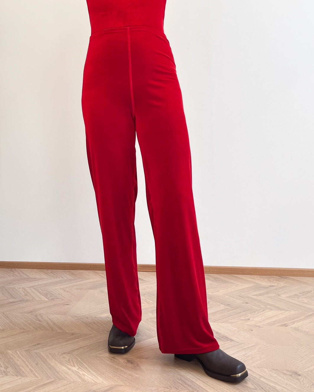 These Simone Wild velvet wide leg pants feature a high waist and a flared silhouette with an elastic waistband for comfort. Designed with extra length, they provide an elegant drape. Crafted from 90% polyester and 10% elastane, they offer a slight stretch. Please note they run a bit small, so consider sizing up. For care, wash at 30°C with caution and avoid tumble drying. Made in Germany.
