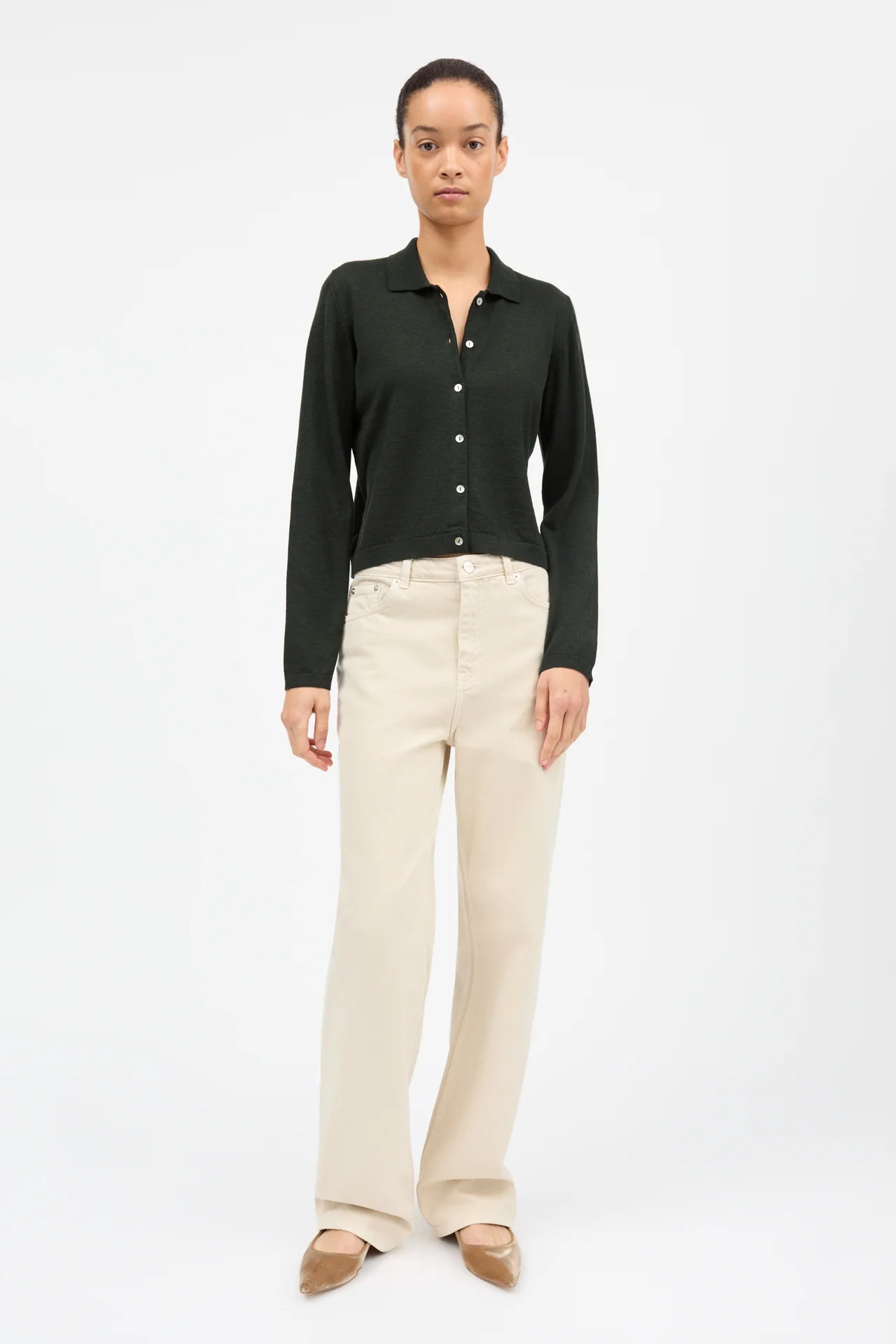 Amethyst Cardigan is a classic polo-shirt style cardigan in light merino wool. It has slightly dropped shoulders and fastens by six mother of pearl buttons down the front.