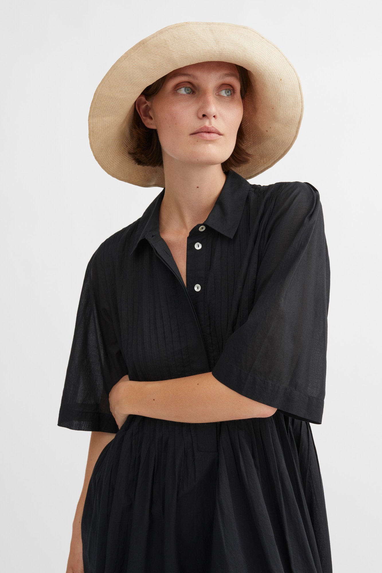 The Dot Shirtdress is a voluminous midi-dress made in soft, organic cotton. The dress features pleats, a shirt collar with mother of pearl buttons, long t-shirt sleeves, and volume in the skirt.