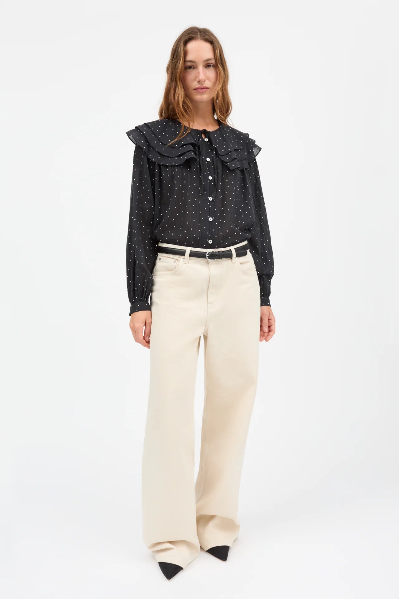 Lilou Shirt has a large collar made from three layered flounces spreading over the shoulders. Made from 100% organic cotton, the shirt has volume sleeves and a self-fabric loop tie at the neck. It fastens up the front with buttons and loops.