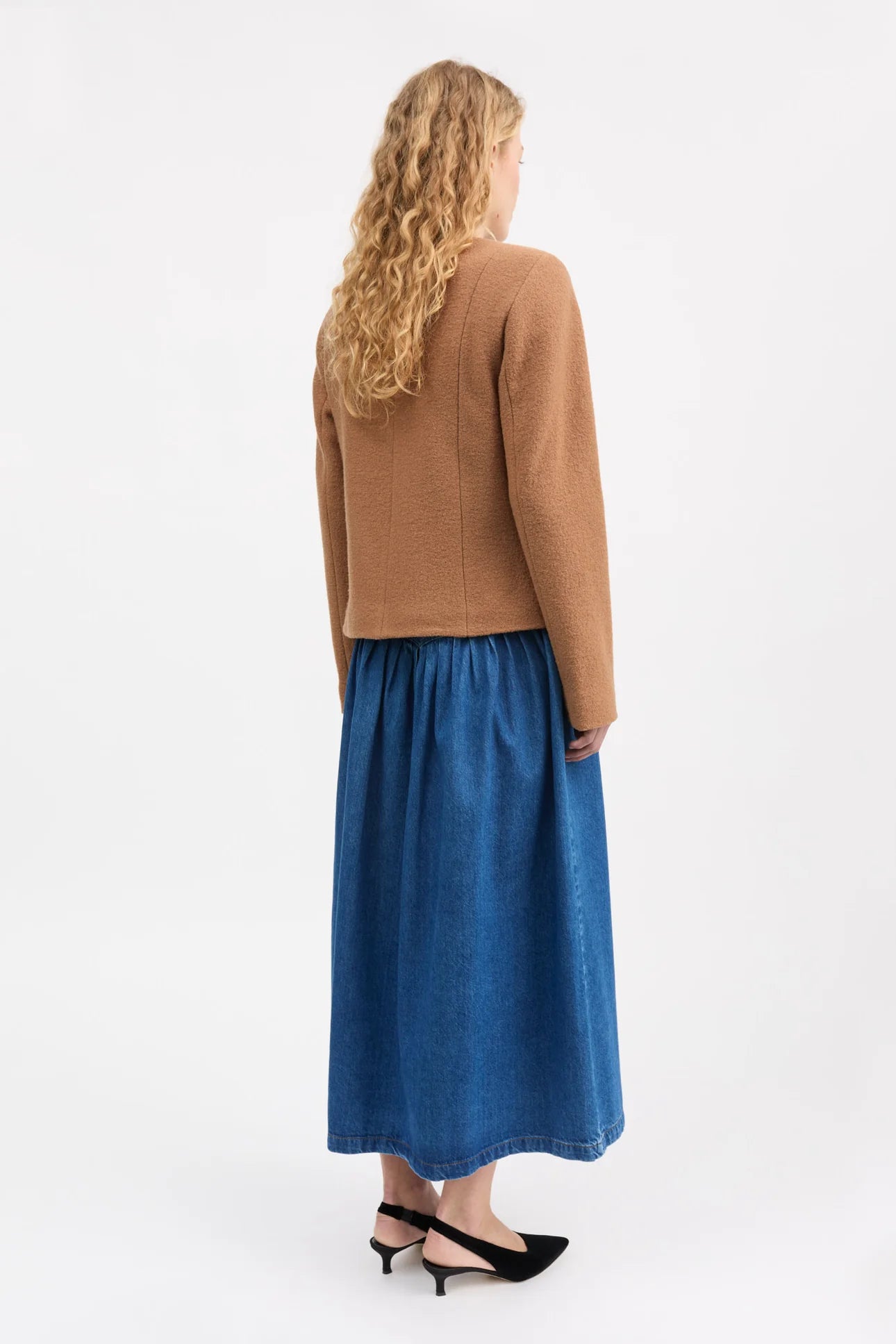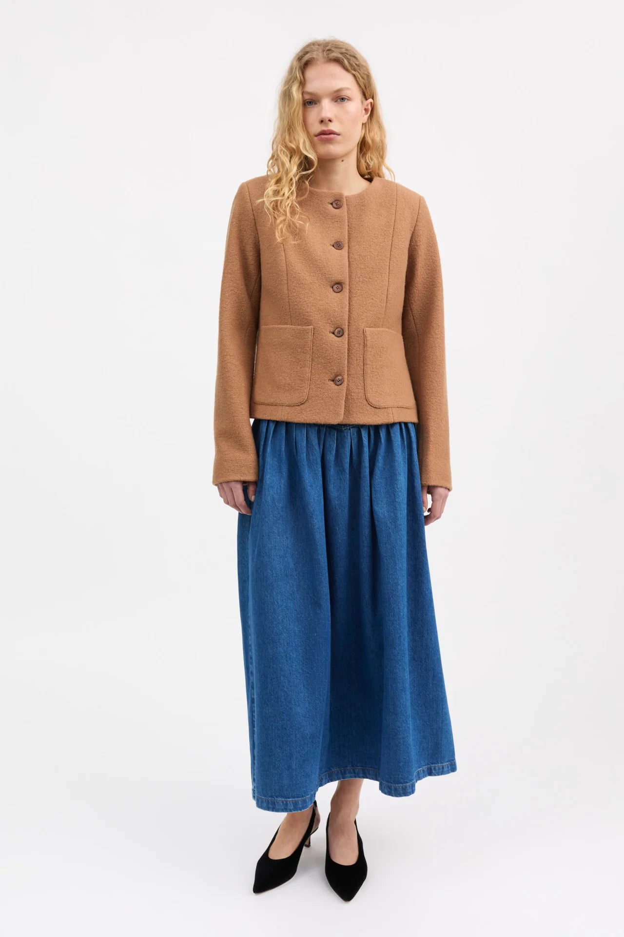 Mona Jacket is a short round collared jacket tailored from 100% wool and is fastened with five buttons down the front. It has two large patch pockets at the front, an is lined with organic cotton.