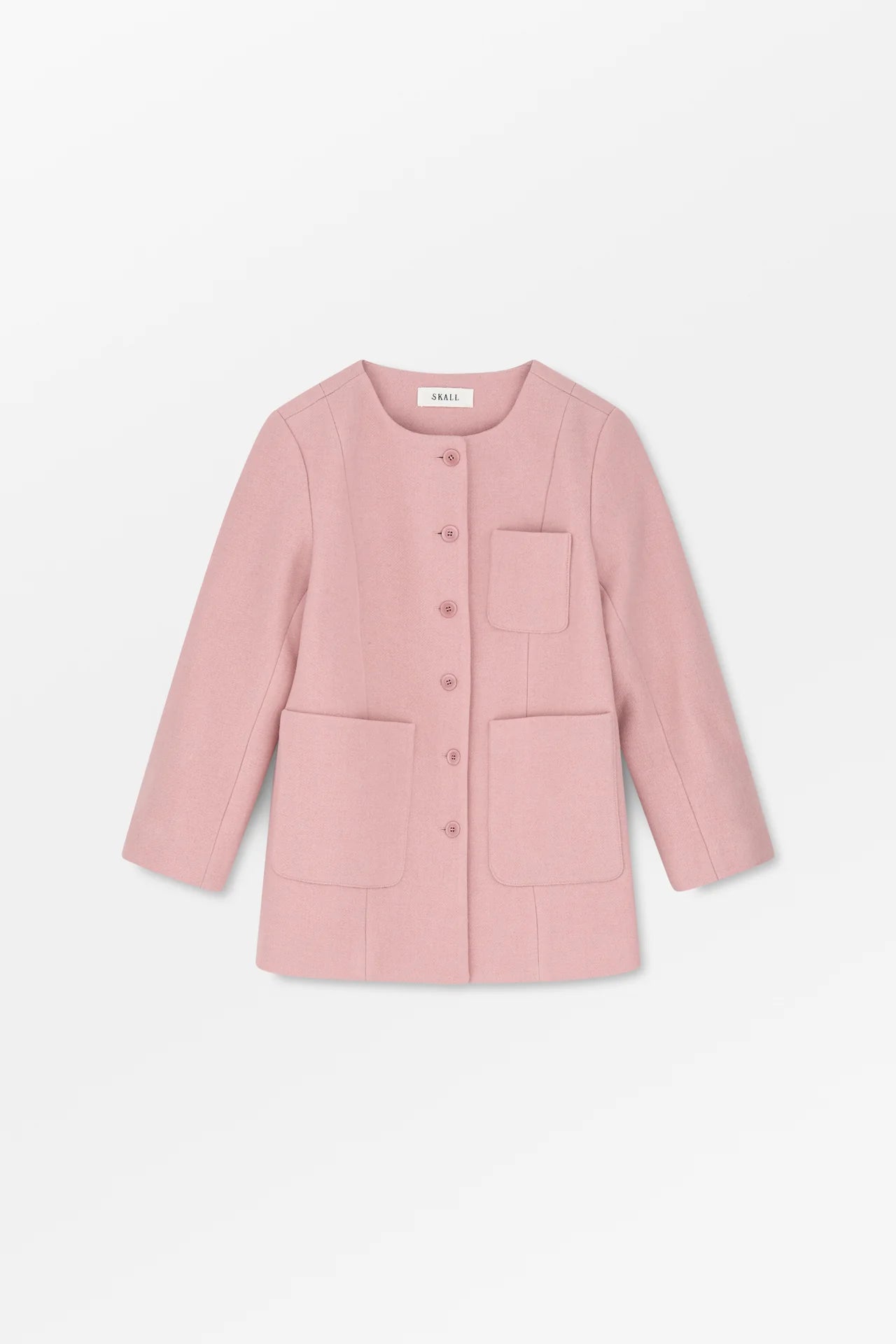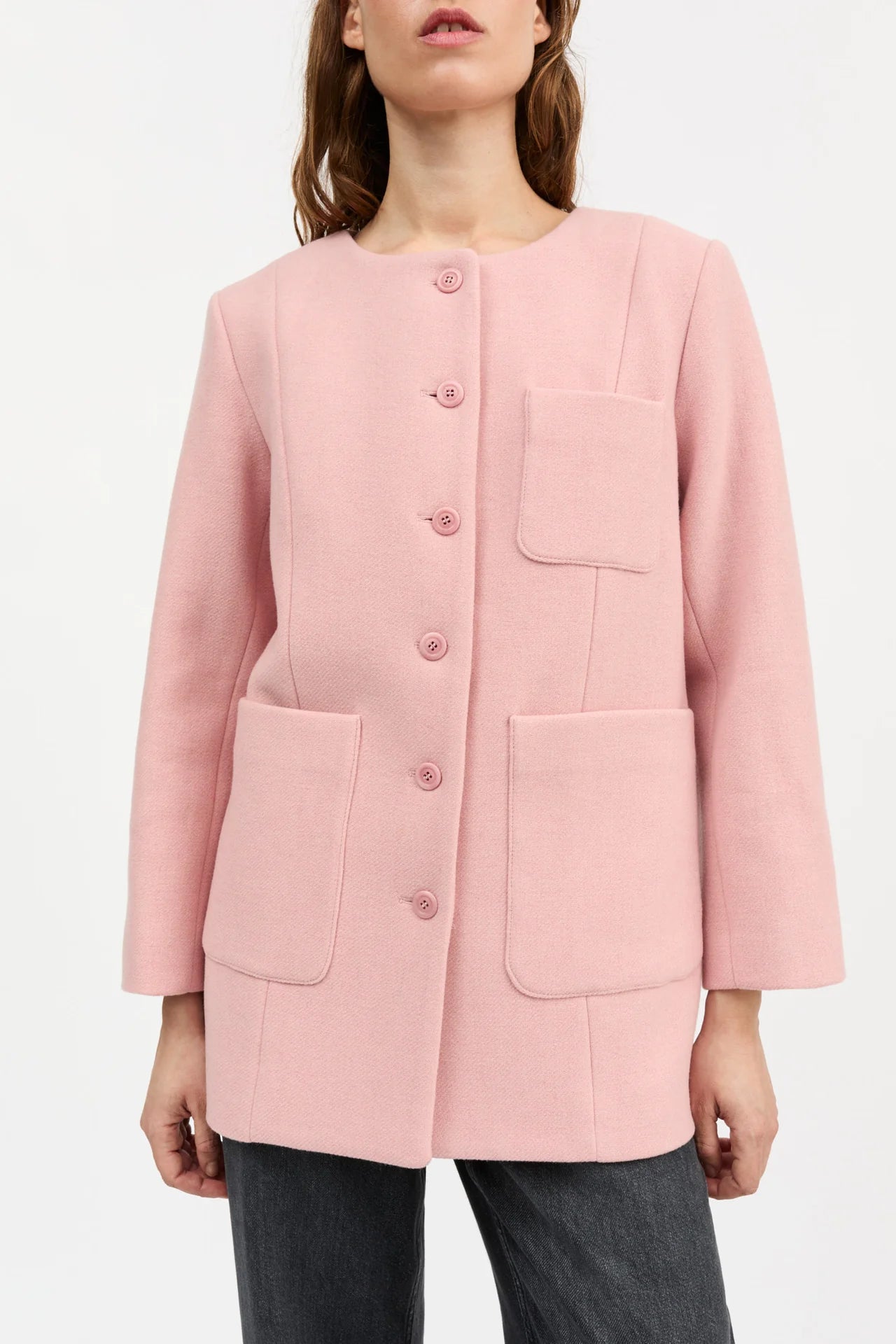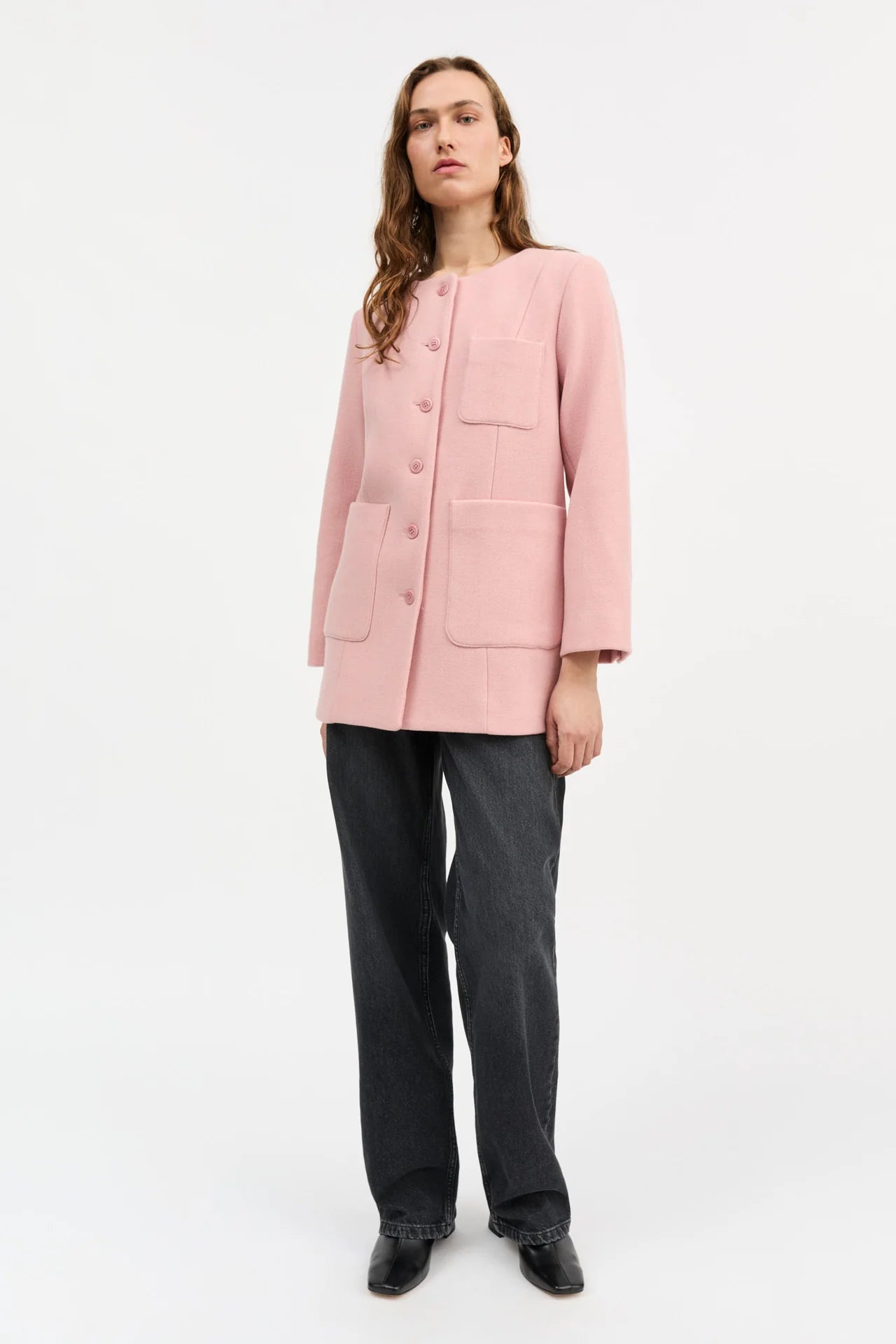 Nina Jacket is a long-line round necked blazer made from 100% recycled wool and fastened with six buttons down the front creating a clean and minimalist look. There are three patch pockets and the two piece sleeves are finished with a slit and buttons at the cuff.