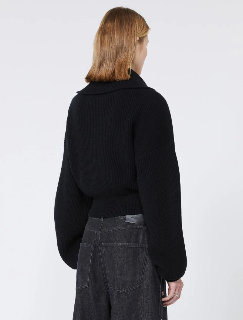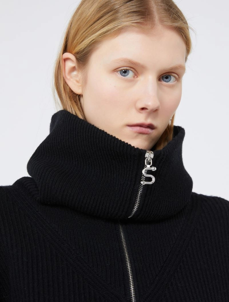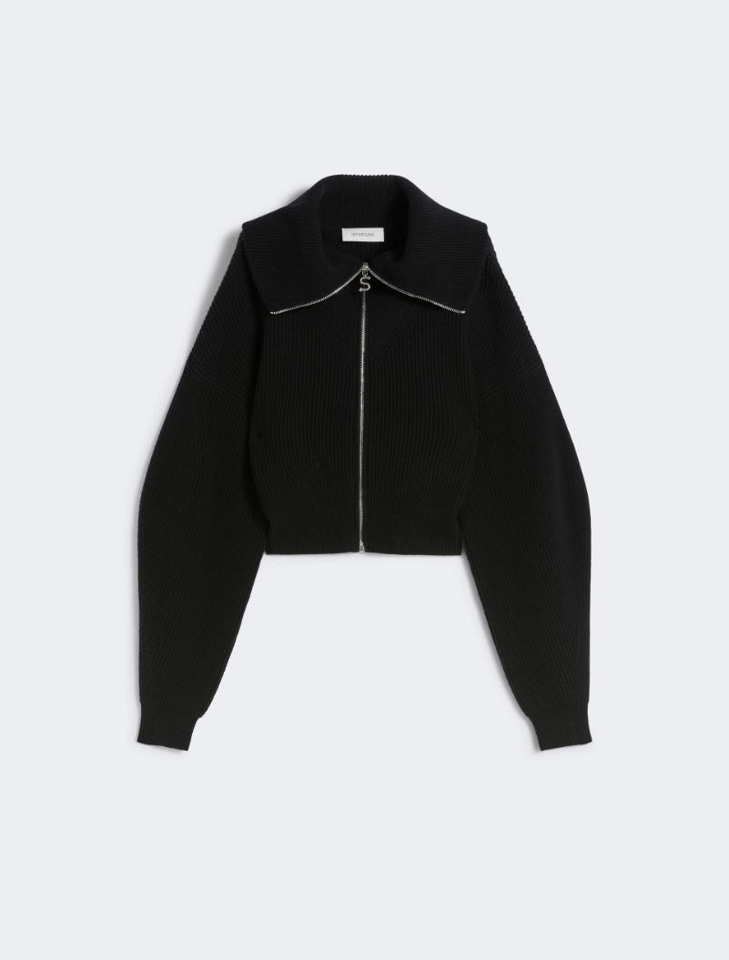 Cardigan made of a wool and cashmere blend, with a soft feel and loose volumes. The wide collar opens with a zip and is worn draped over the shoulders.
