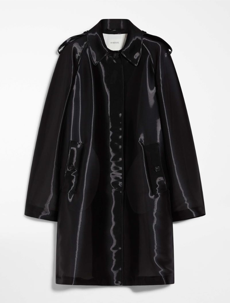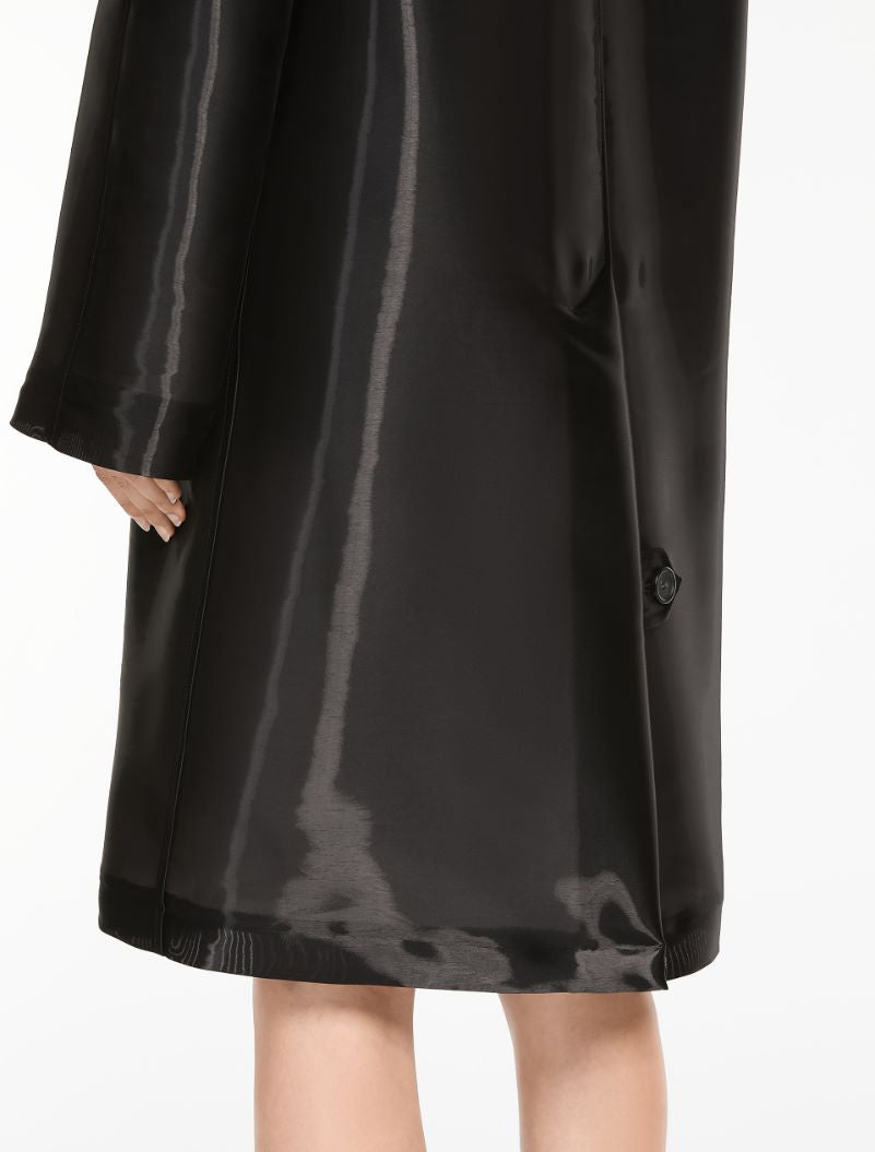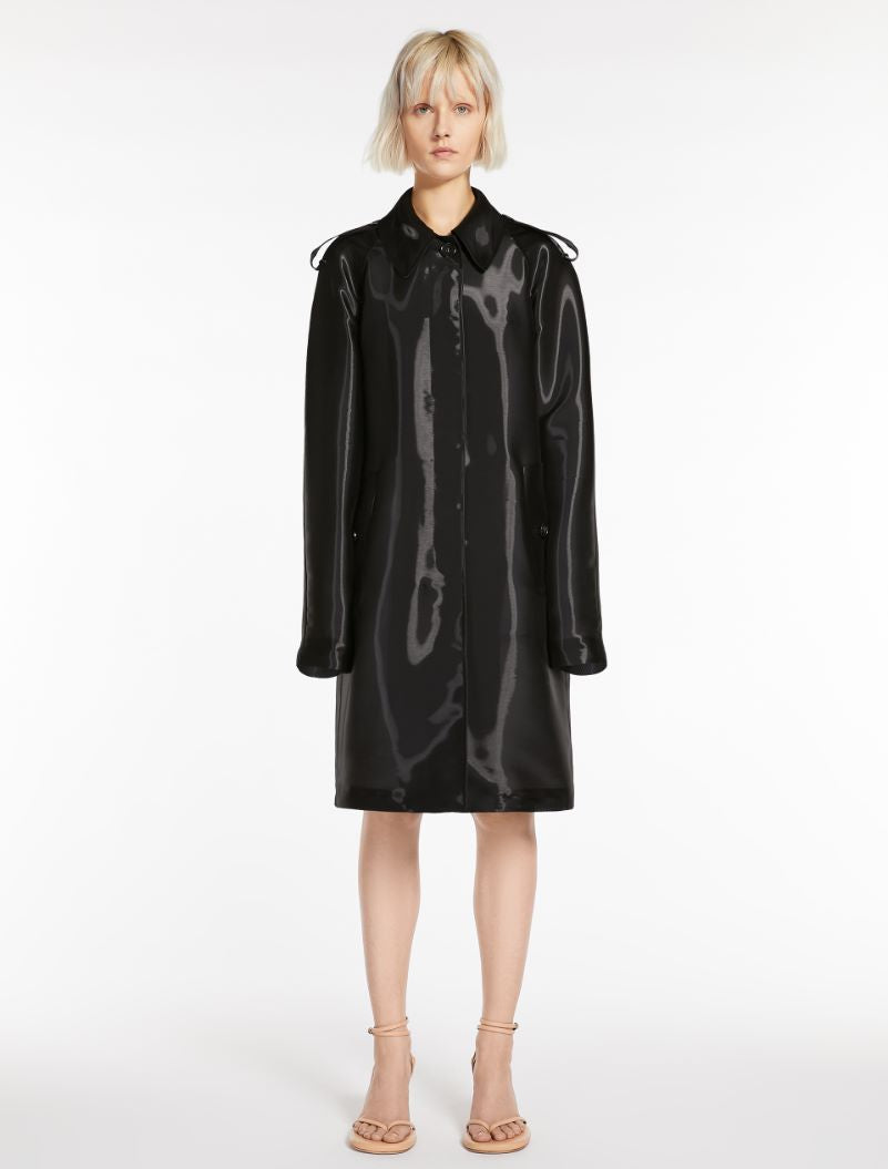 Oversized overcoat in silk-blend gazar fabric. The classic design boasts raglan sleeves, a shirt collar and shoulder epaulettes. Furthermore, it is made clean-cut by the placket-covered button fastening on the front and the buttoned tab detail-securing overlapping rear vent. The garment is fully lined in contrasting cotton fabric.