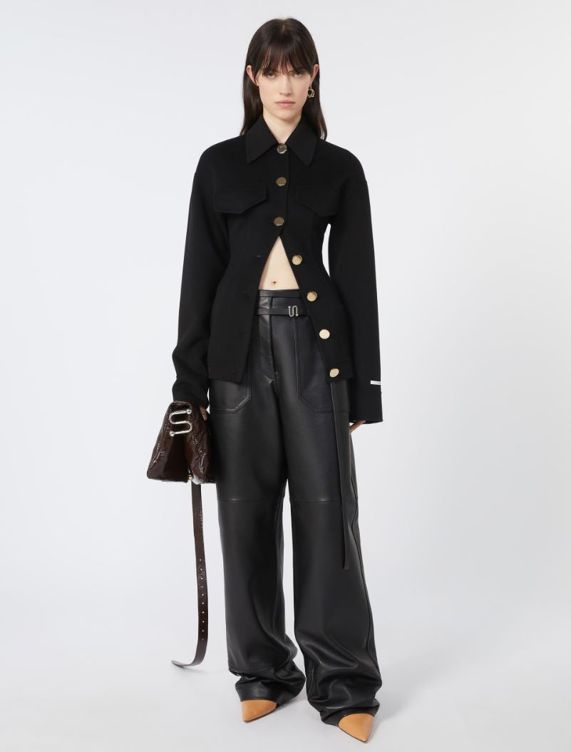 Fitted pea coat made from double pure wool, with deep pleats and details inspired by denim models. Closure with large mirrored metal buttons with engraved logo.