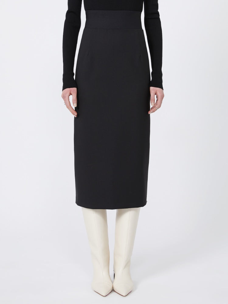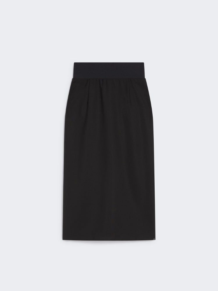 Feminine longuette skirt featuring a back slit and a contrasting elasticated band to accentuate the silhouette.