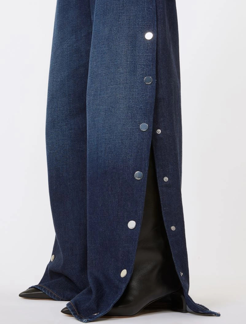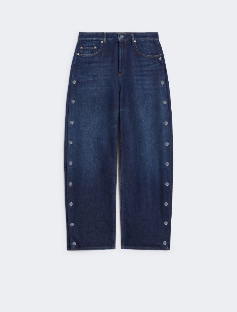 Jeans in soft and lightweight blue denim, with low waist and crotch. The garment features contrasting tobacco thread stitching and custom snap buttons along the sides.