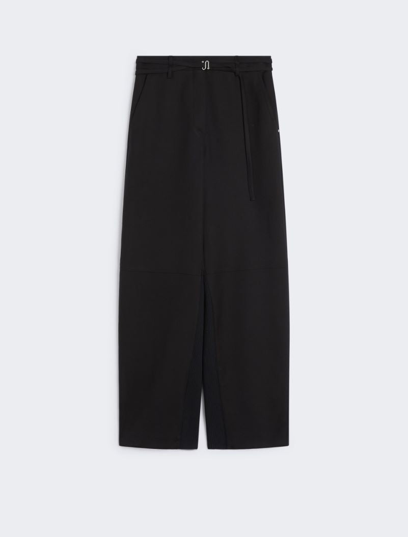 Trousers in double cotton and viscose cady, with a straight line and slightly low waist. High belt loops at the waist support the double-wrap belt with S-buckle. A knitted insert on the inside of the leg adds an original detail.