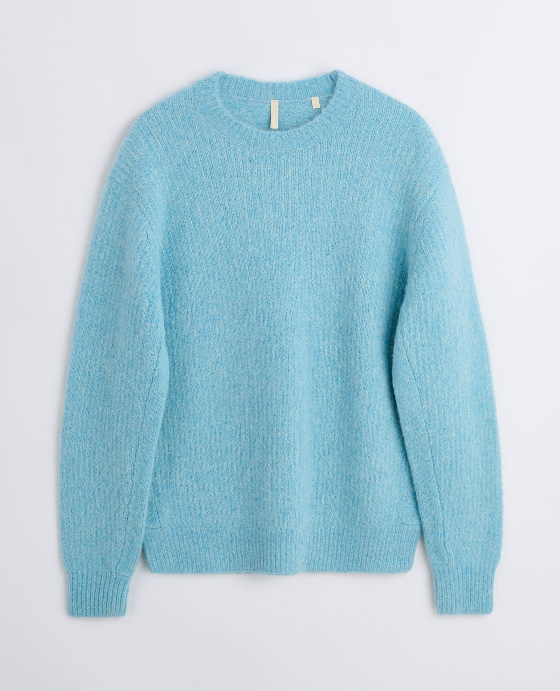 The SUNFLOWER Yak Sweater features a refined crew neck with subtly dropped shoulders for a modern silhouette. Crafted in a 5-gauge brushed rib knit, it offers a soft texture and enhanced collar detail for added structure. This sweater uses a luxurious blend of 31% yak, 31% alpaca, 16% RWS extrafine merino wool, and 22% recycled nylon, ensuring lightweight warmth, exceptional softness, and durability. Ideal for those seeking expert craftsmanship and sustainable materials in a versatile knitwear piece.
