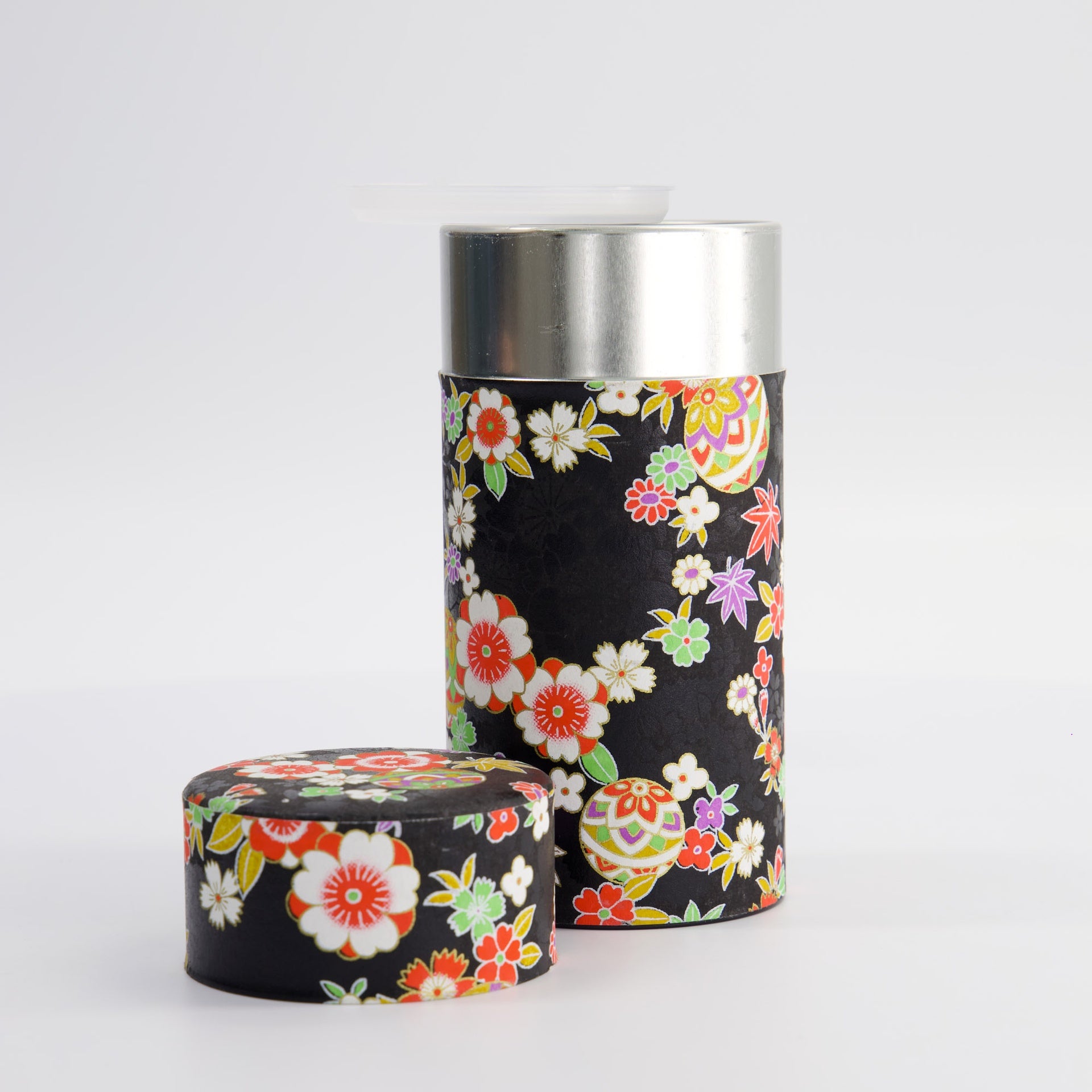Stainless steel tea container with black flower design. Made in Japan.