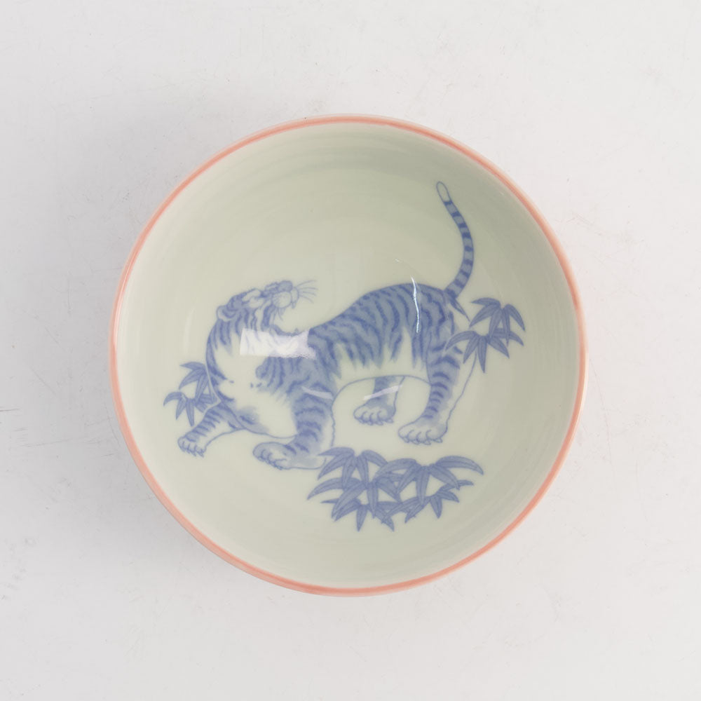 Porcelain rice bowl with stylish tiger design in red. Dishwasher and microwave save. Made in Japan.